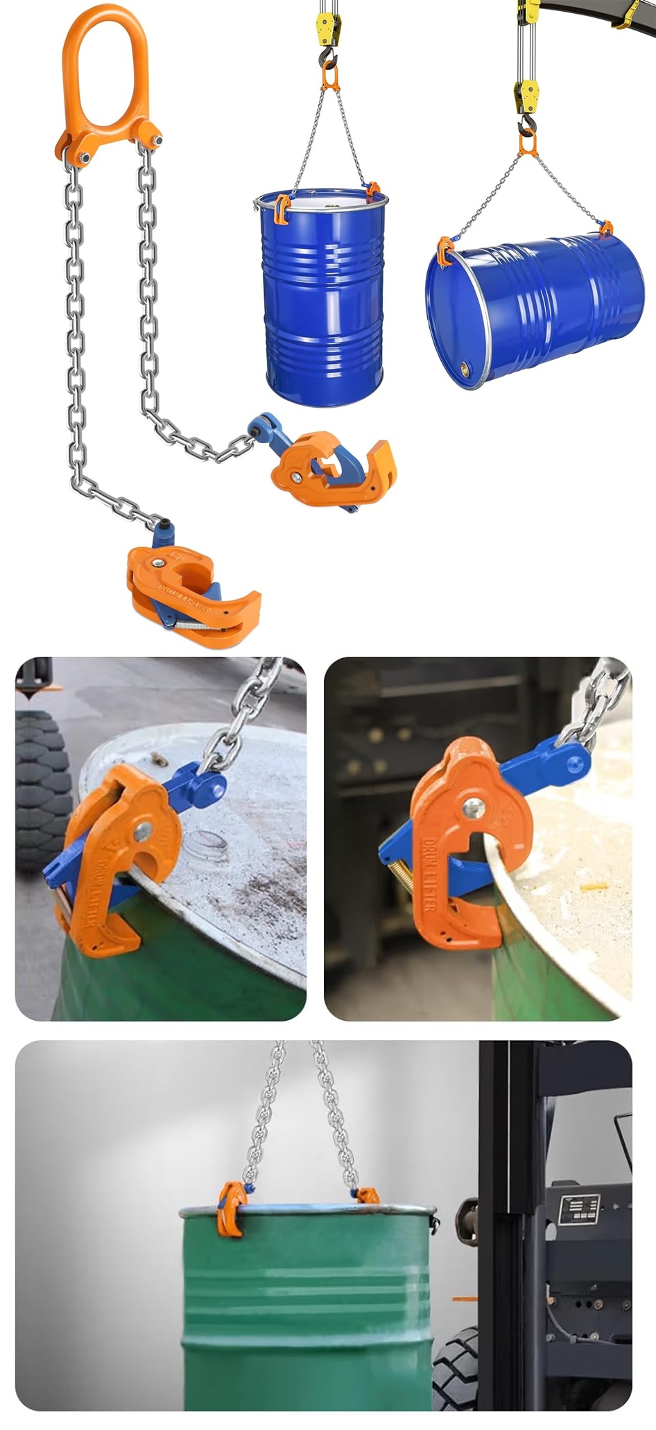 ZASTOSOWANIE: Zawiesie do beczek z chwytakami jest idealne do podnoszenia beczek za pomocą suwnicy, wózka widłowego, dźwigu lub innego wciągnika. Może być używany do podnoszenia, obracania lub przechylania stalowych beczek do 1000 kg.