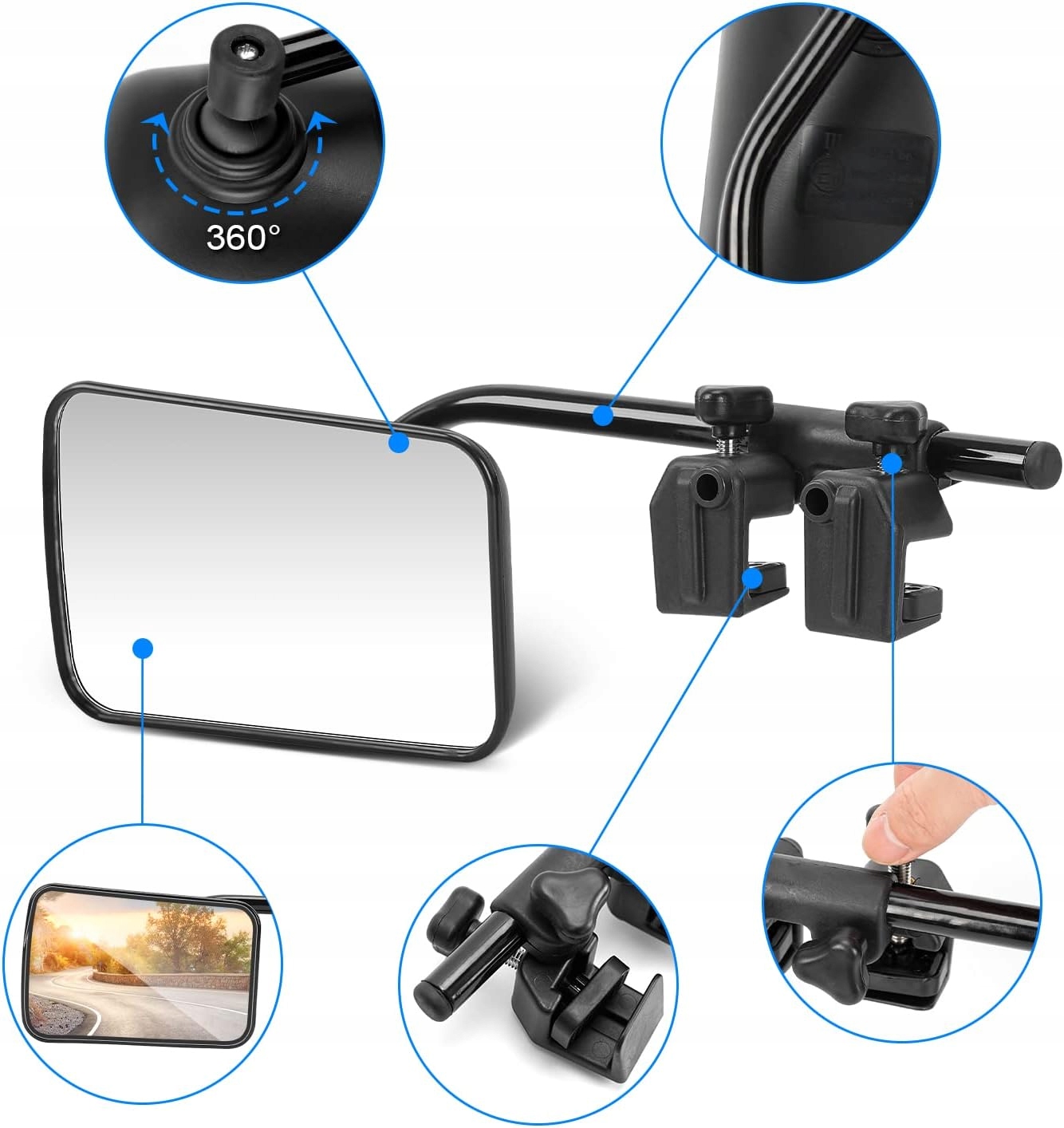 Rozszerzenie pola widzenia Regulowane lusterko holownicze ma 360-stopniową regulację kuli i podstawy, co zapewnia lepszą widoczność. Lusterko pomocnicze zapewnia bezpieczeństwo i pewność podczas jazdy.