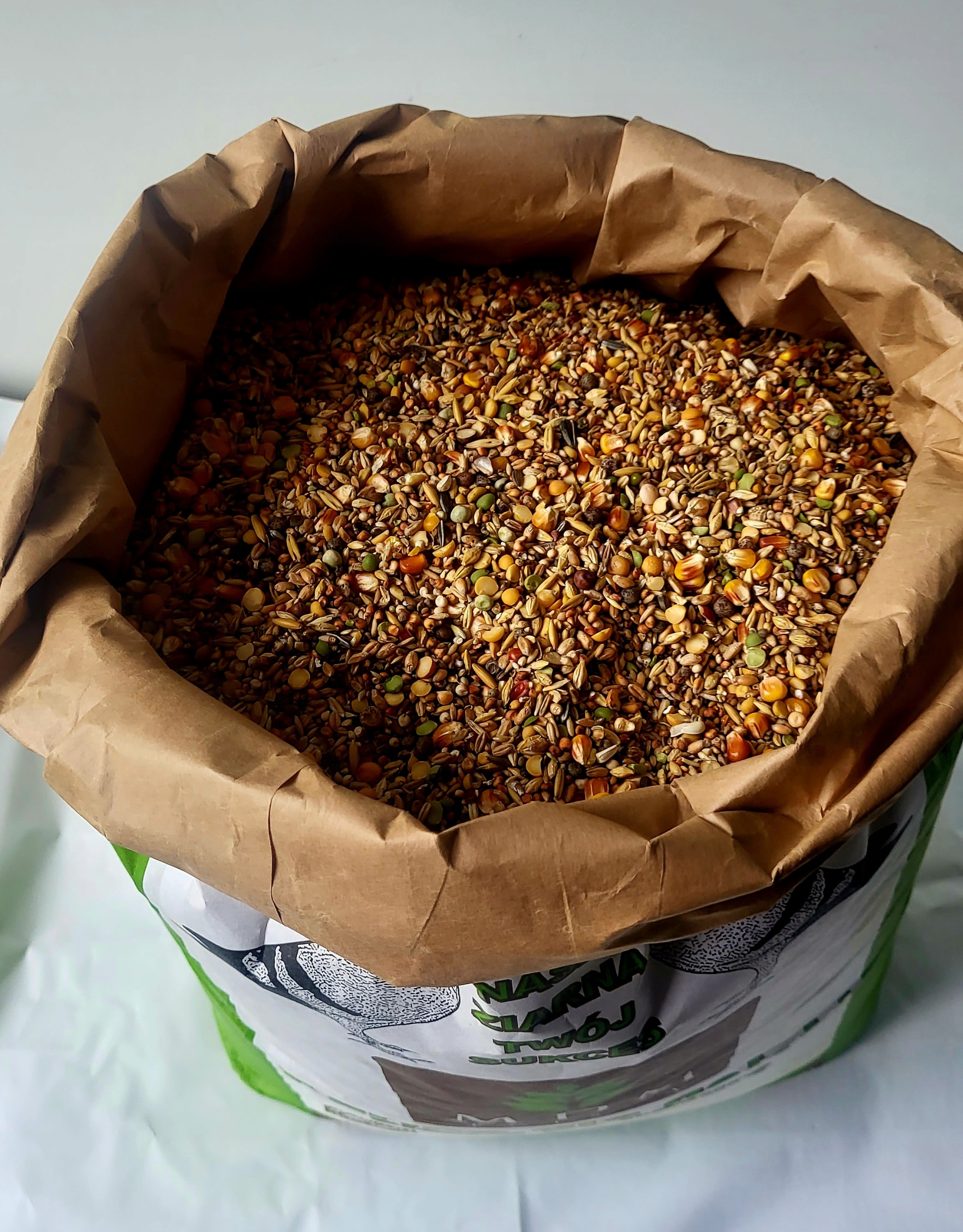 Karma zawiera kilka rodzajów ziaren, m.in. groch, sorgo, jęczmień, kukurydzę (2 rodzaje), proso, pszenicę, słoneczniki, itp.