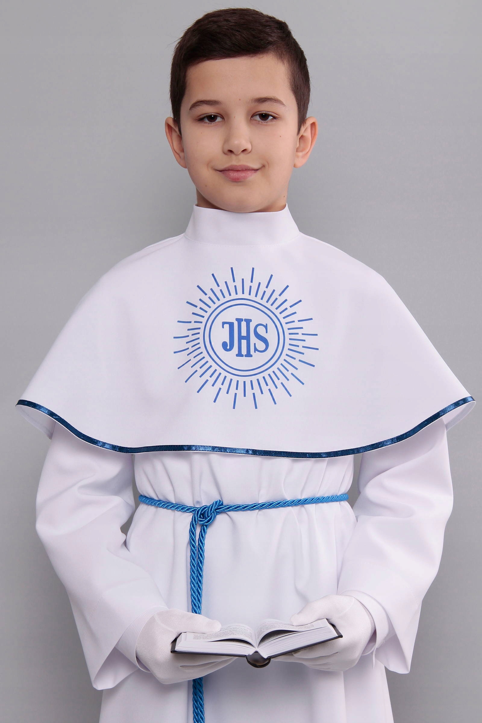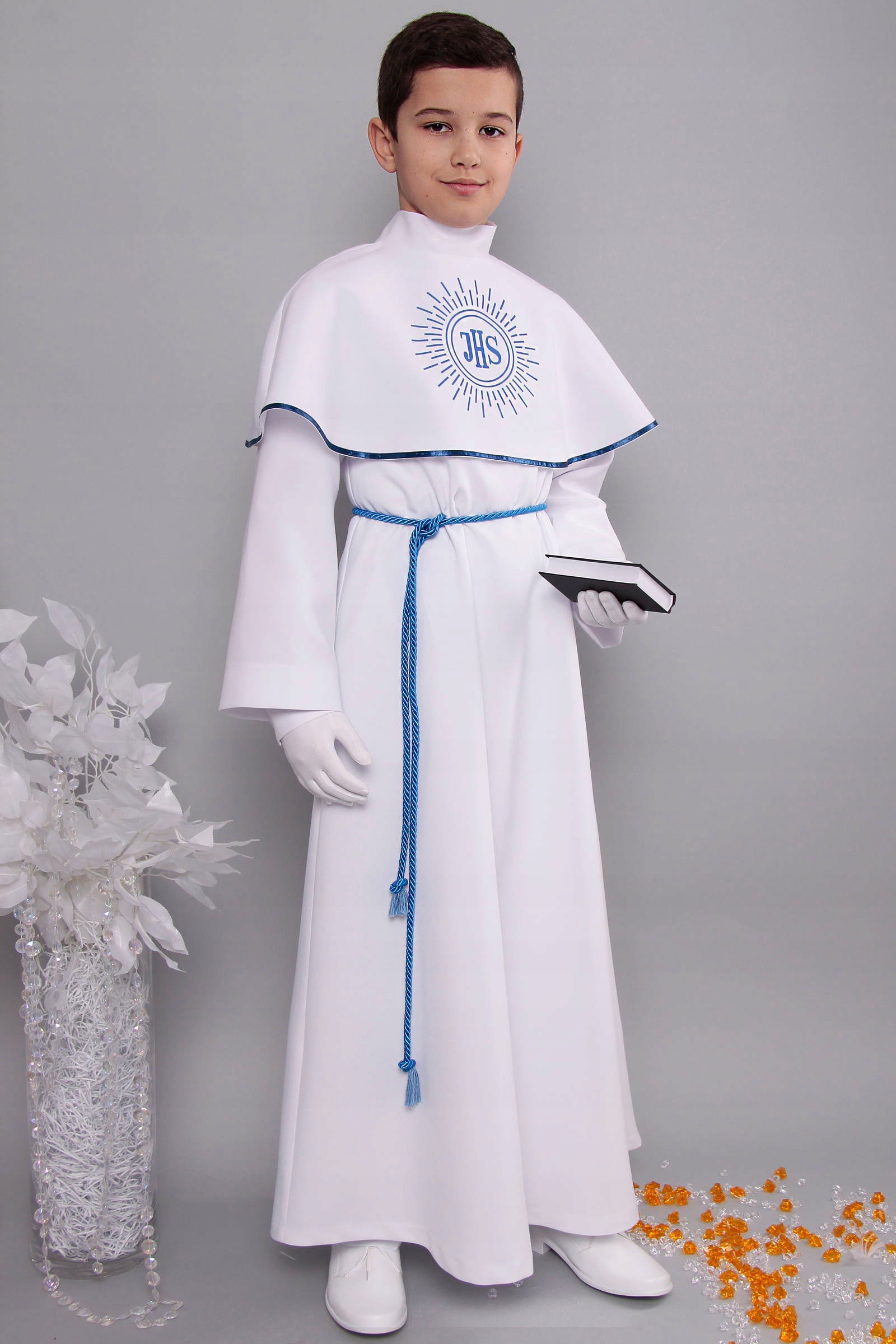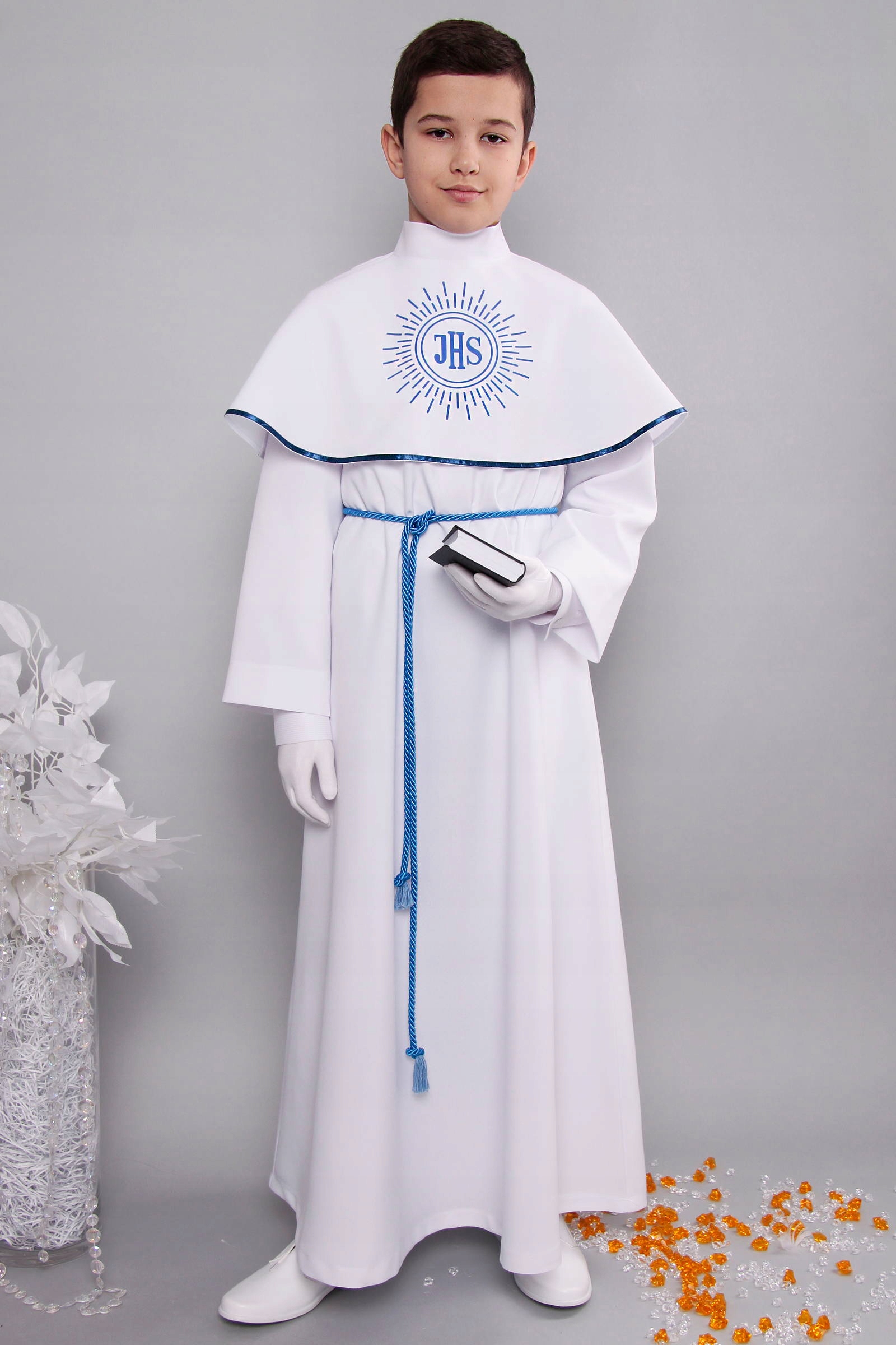 Klasyczna i elegancka komunijna alba dla chłopca z oddzielnym kołnierzem.