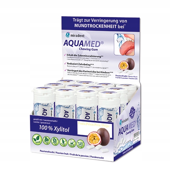 Guma do żucia słodzona 100% ksylitolem zmniejszająca dolegliwości związane z suchością jamy ustnej. Podczas żucia drażetki powodują przyjemne i wilgotne odczucie w ustach. Gumy są zalecane do stosowania przy zaburzeniu pracy gruczołów ślinianek.