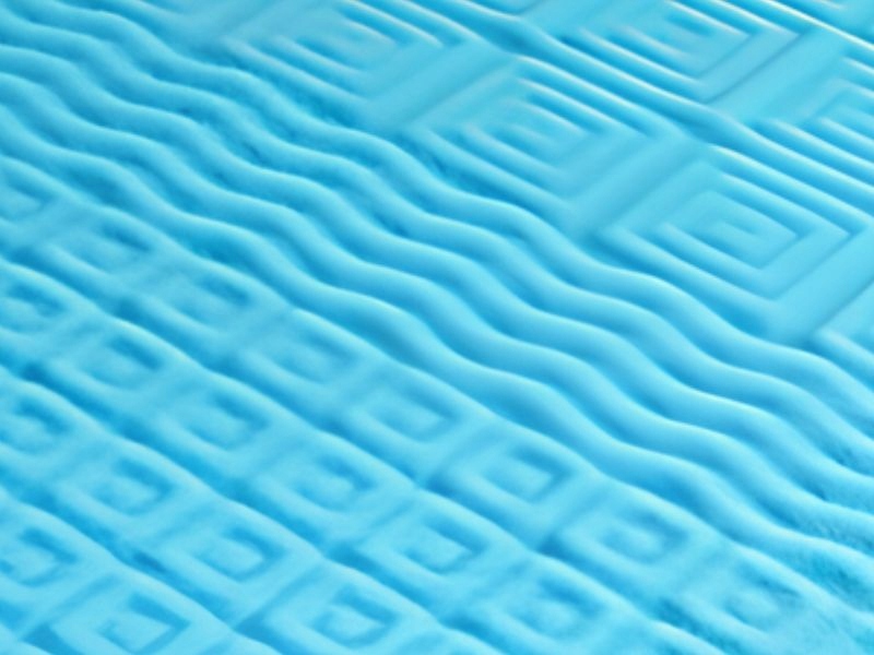 Pianka Blue z profilowanymi strefami w formie „kostek” i „fal” zapewnia przyjemne otulenie i delikatny efekt masażu podczas ruchu. Specjalne nacięcia umożliwiają lepsze dopasowanie do ciała i rozluźnienie mięśni. Dodatkowo falista struktura poprawia cyrkulację powietrza, odprowadzając ciepło i wilgoć, co zwiększa higienę, świeżość oraz komfort snu.