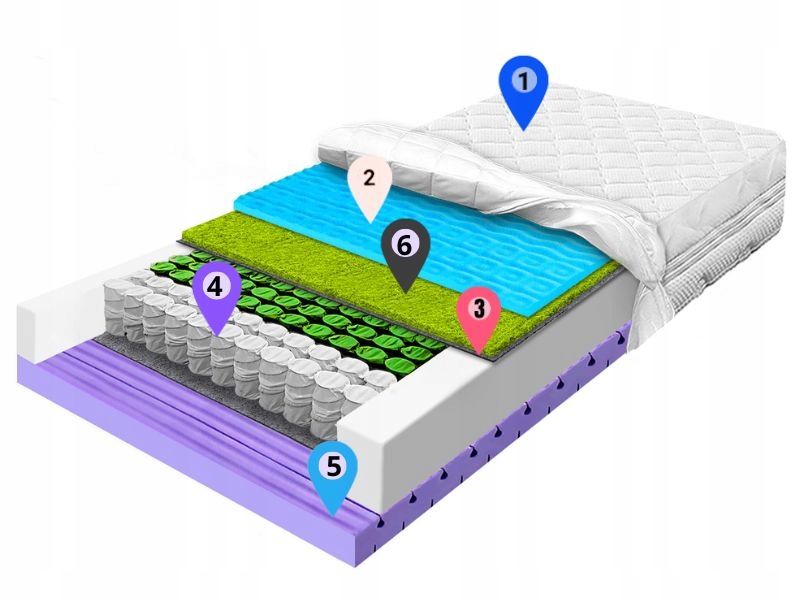 Model POCKET CONTI BREEZE BLUE to materac dwustronny, oferujący dwie różne powierzchnie użytkowe. Jedna z nich wyposażona jest w 5-centymetrową warstwę pianki Conti (nr 5), która zapewnia efekt delikatnego masażu i lepsze dopasowanie do ciała podczas snu. Druga strona zawiera trawę morską (nr 6) oraz 3,5-centymetrową warstwę pianki Blue (nr 2), oferując bardziej przewiewne i stabilne podłoże. Wnętrze materaca stanowią połączone sprężyny kieszeniowe (nr 4), które wspierają całą konstrukcję. Dodatkowe elementy to przekładka filcowa (nr 3) oraz wysokiej jakości pokrowiec (nr 1).