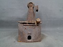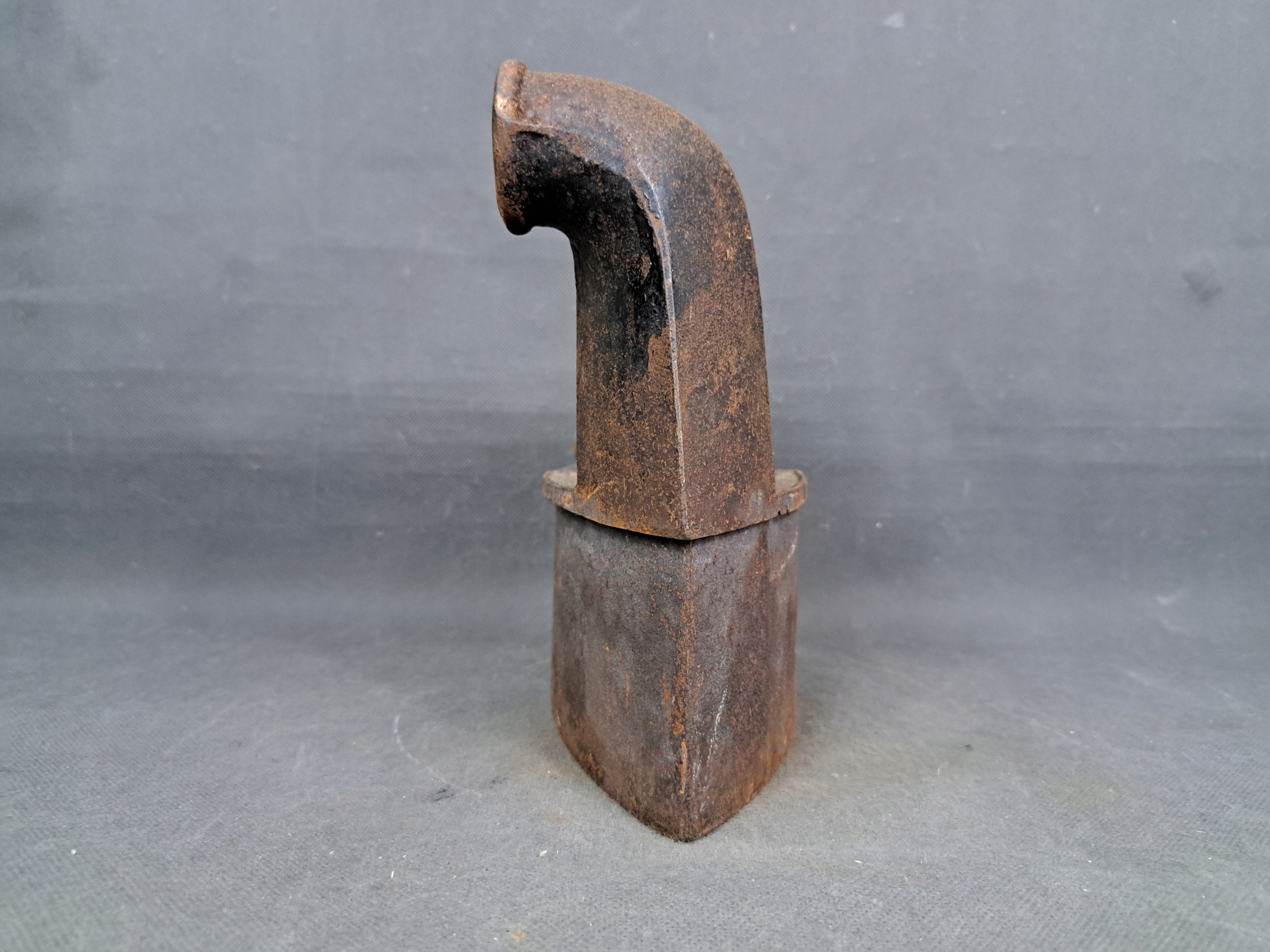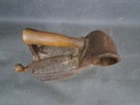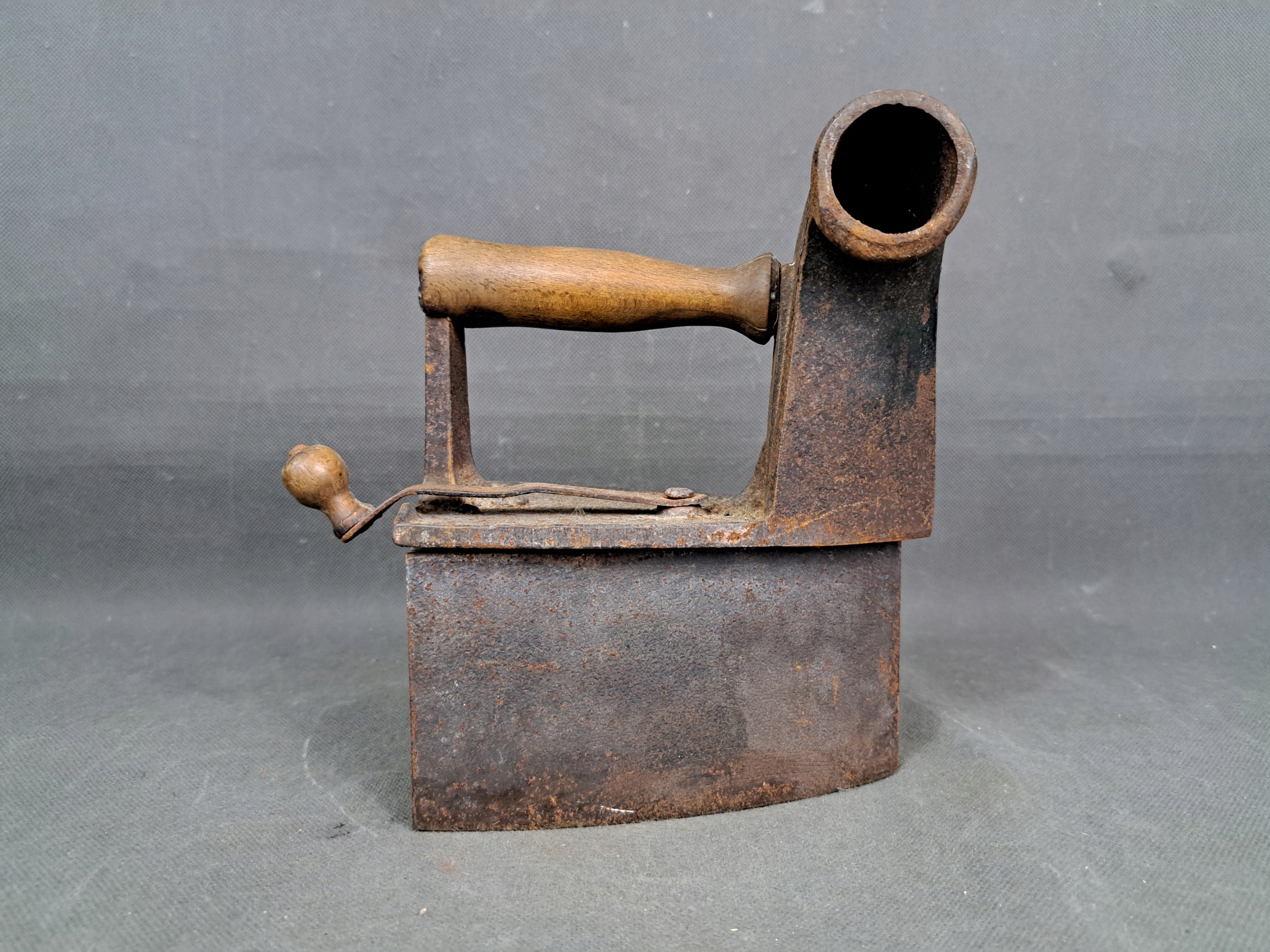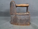 Antyczne żelazko węglowe z kominem. Wyposażone w drewnianą rączkę.