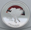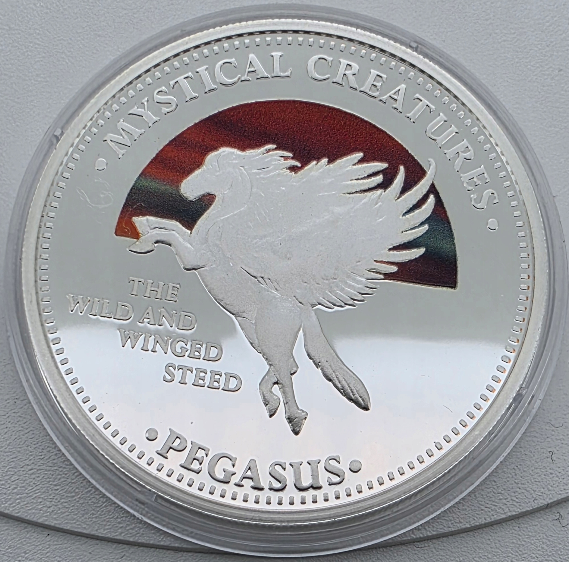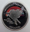Unikatowa moneta kolekcjonerska z serii „Mystical Creatures”, przedstawiająca mitycznego Pegaza – skrzydlatego konia z mitologii greckiej, symbol wolności, siły i boskiej inspiracji.