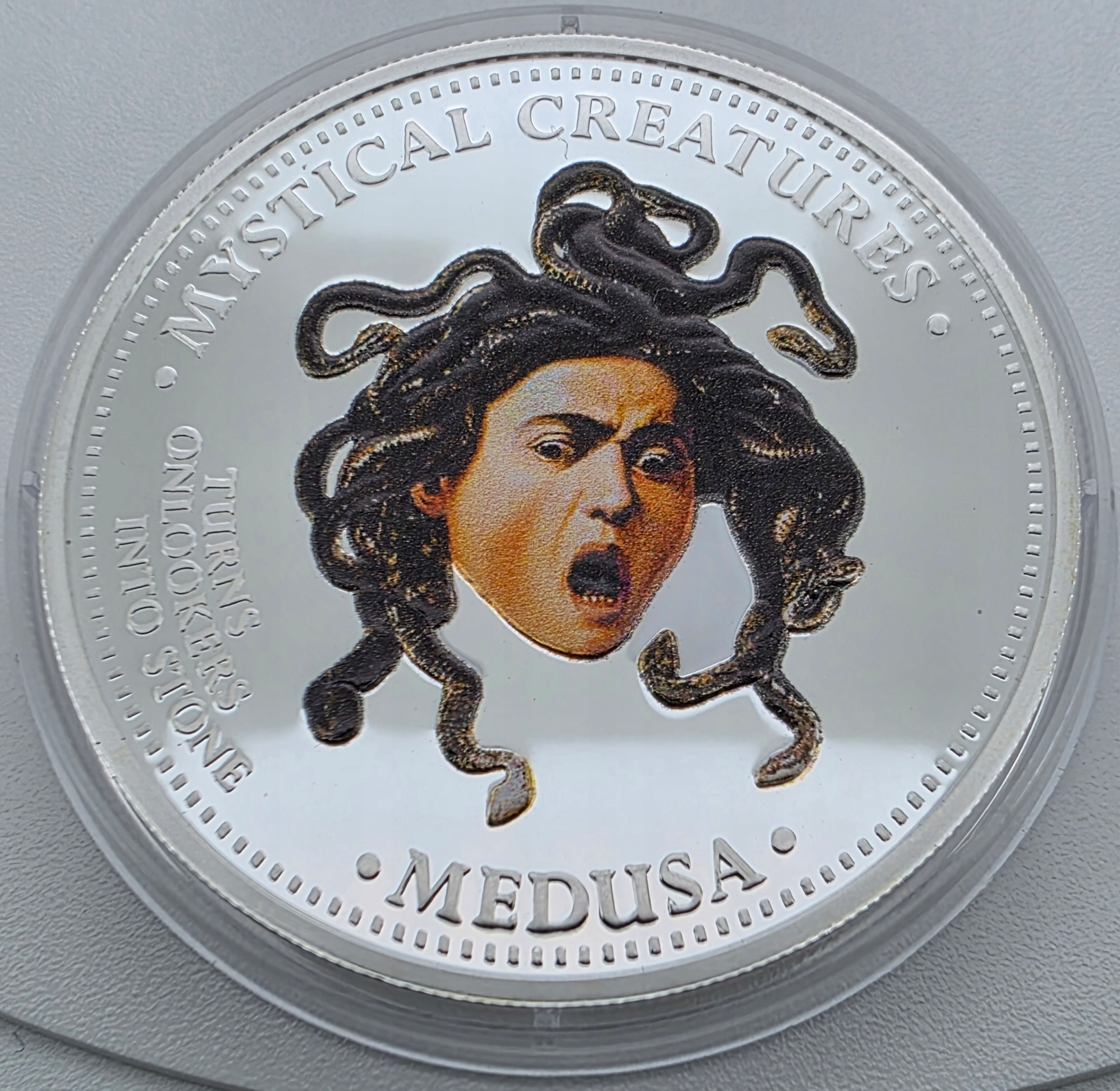 Wyjątkowa moneta kolekcjonerska z cenionej serii „Mystical Creatures”, przedstawiającej postacie z mitologii i legend świata. Ten egzemplarz ukazuje Meduzę – jedną z trzech gorgon z mitologii greckiej, której wzrok potrafił zamieniać ludzi w kamień.
