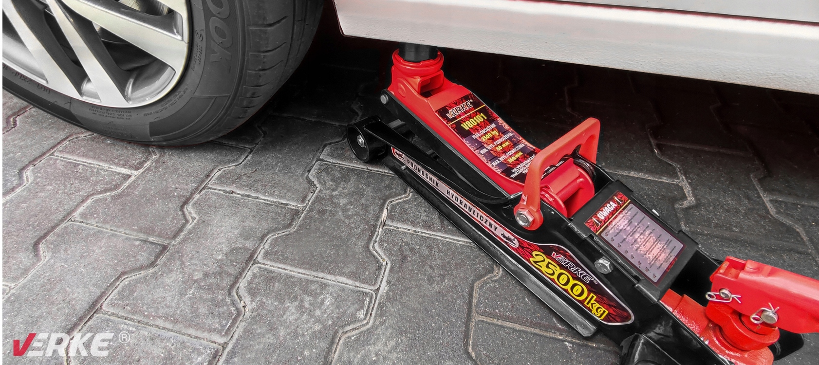 ▶ Podnośnik samochodowy firmy VERKE®. Posiada konstrukcję opartą o zasadę dźwignika ramieniowego z napędem hydraulicznym działającym w osi poziomej. Cechą charakterystyczną podnośnika jest jego niewielka wysokość początkowa, dzięki czemu można wsunąć podnośnik pod każde auto, szczególnie przydatne przy niskich samochodach sportowych. Niezbędny w warsztatach samochodowych, serwisach ogumienia i stacjach obsługi pojazdów.