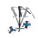 Model VT2 od marki Benro to praktyczne akcesorium dla użytkowników monopodów, którzy pragną polepszyć stabilność i funkcjonalność swojego sprzętu — zwłaszcza podczas fotografii lub filmowania w warunkach, w których jedna noga monopodu może być niewystarczająca. Baza wyposażona jest w gwint 3/8″-16, dzięki czemu pasuje do większości monopodów z wymiennym stożkiem/stopką. Konstrukcja trójnogowa pozwala na zamocowanie monopodu jako „mini statywu”, co dodaje stabilności i bezpieczeństwa przy podłączonym aparacie lub kamerze.