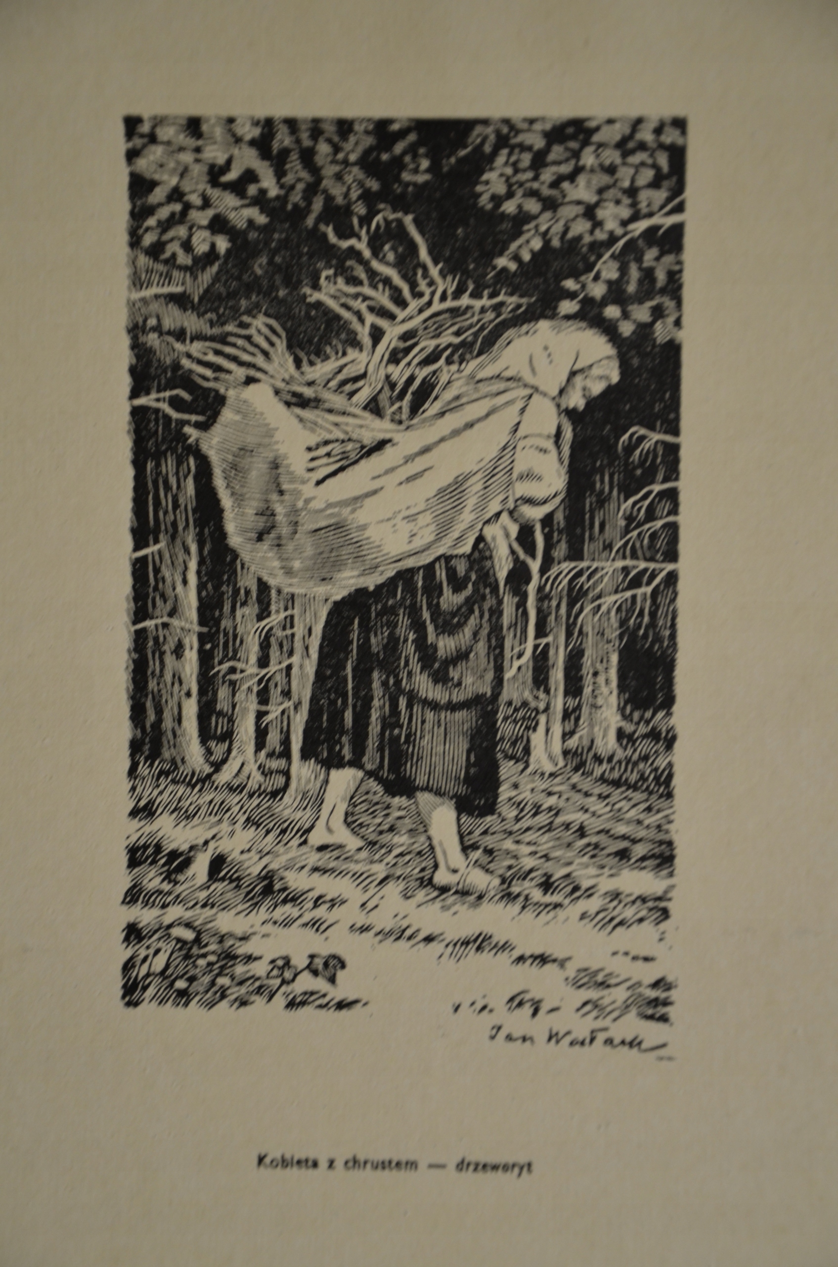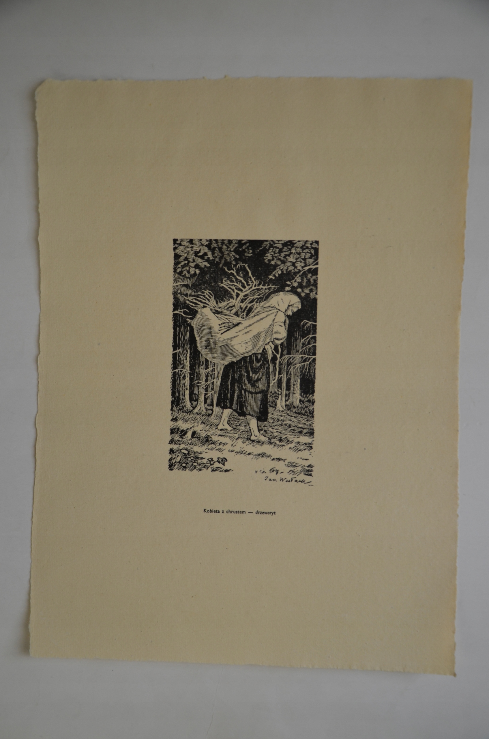 Jan Wałach "Kobieta z chrustem" - drzeworyt na papierze czerpanym - reprodukcja z 1979 roku
