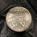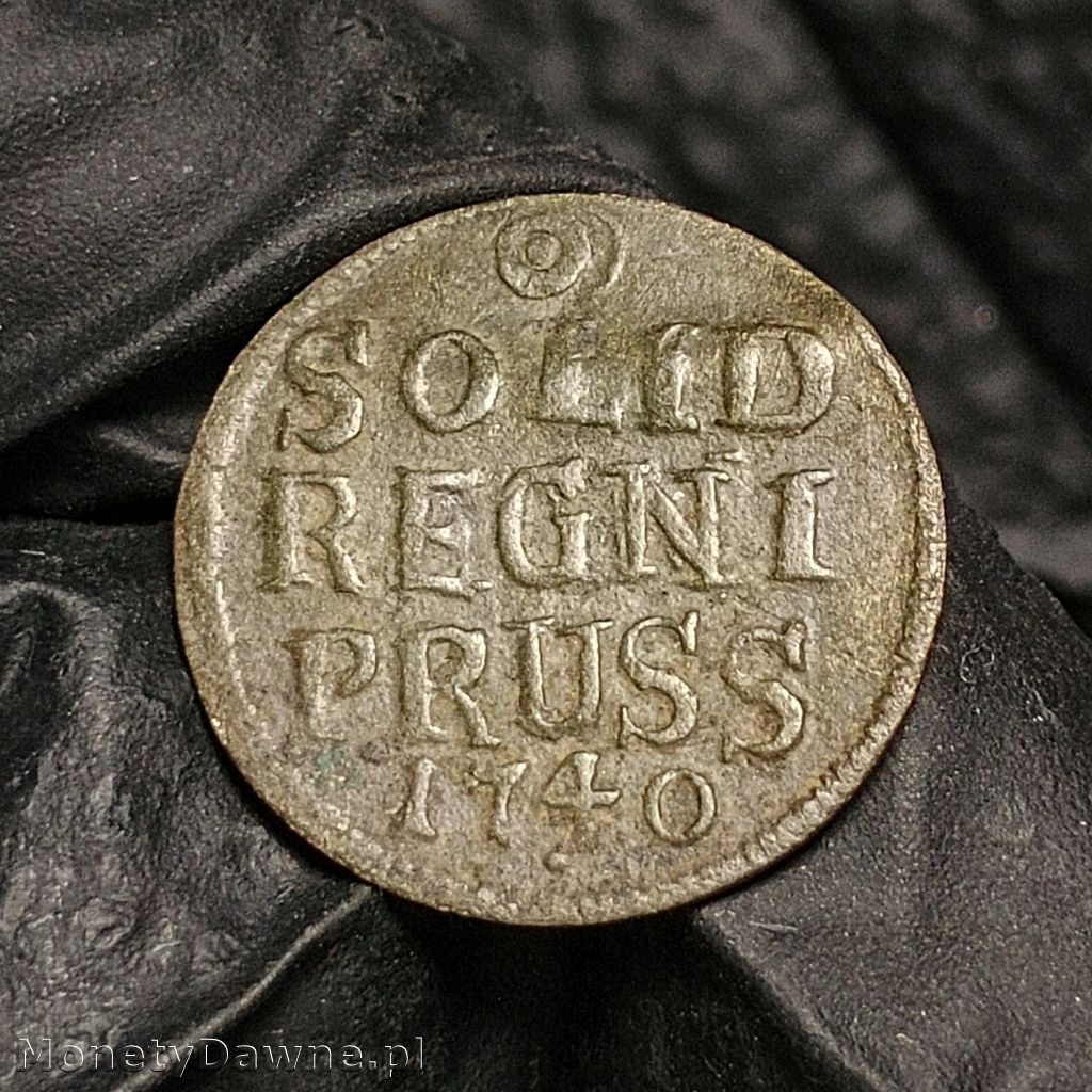 szeląg 1740, Prusy, Fryderyk Wilhelm I; obiegowy egzemplarz w patynie, nieznacznie gięty.