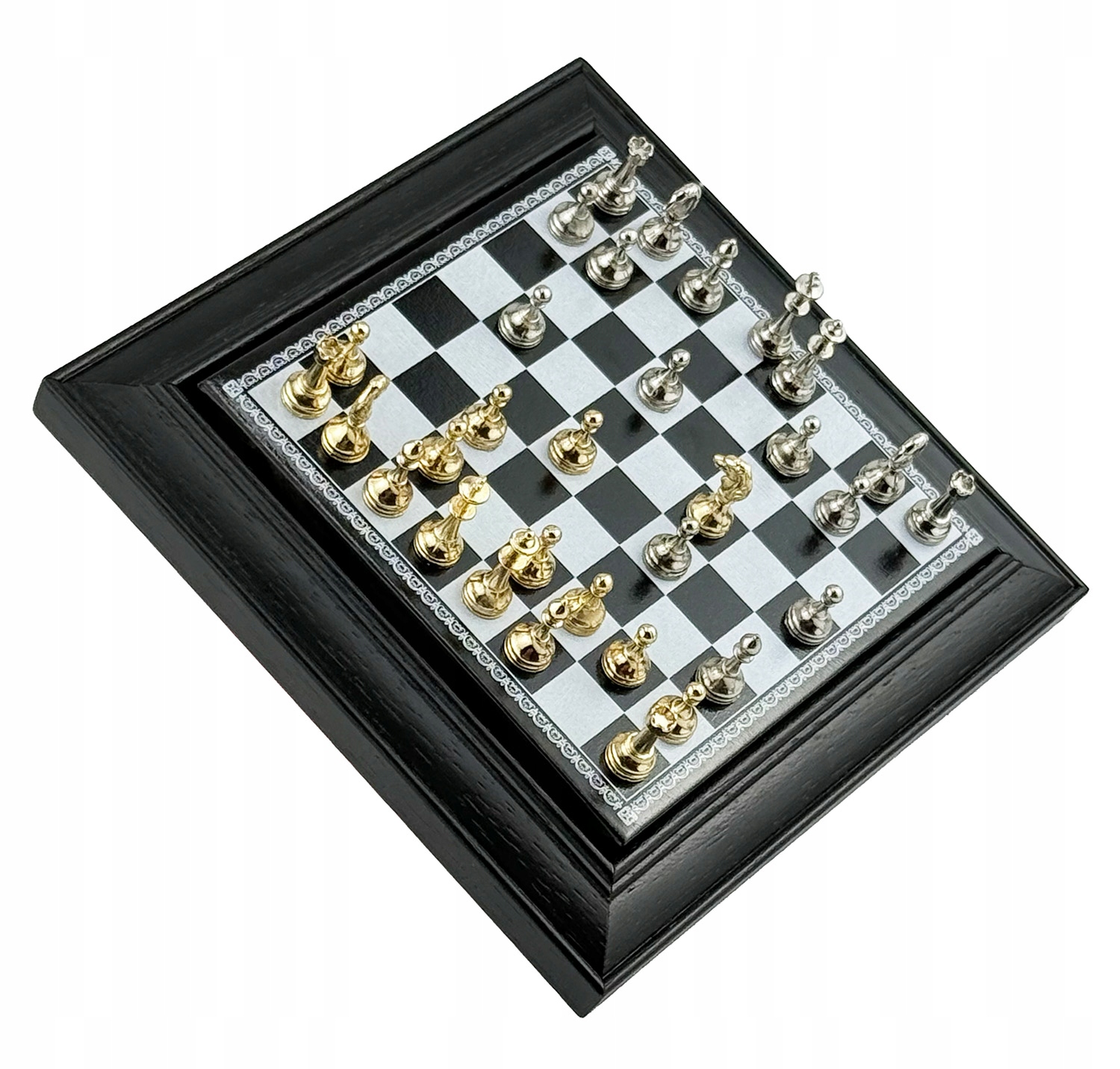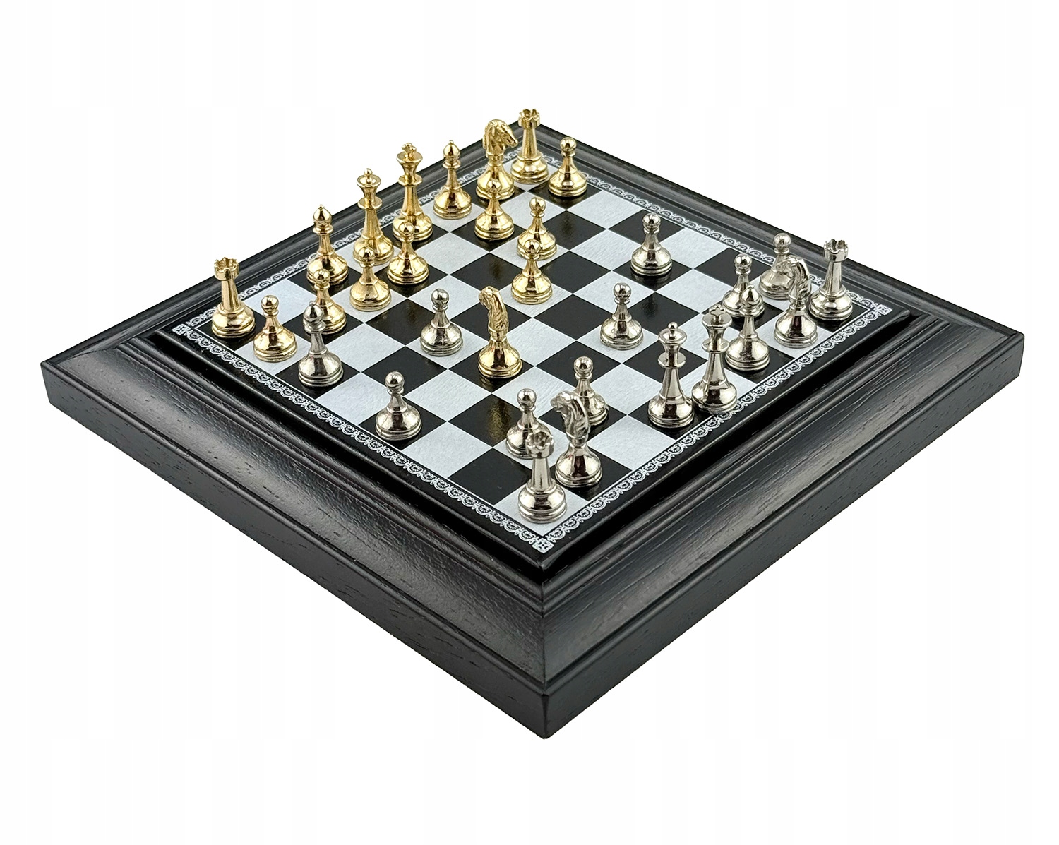 Kompaktowy magnetyczny zestaw szachowy idealny w podróż i na biurko. Metalowe figury w kolorach złotym i srebrnym stabilnie trzymają się pól. Drewniana szkatułka z wierzchem z eko-skóry skrywa w środku przedział na figury, więc wszystko jest zawsze uporządkowane. Świetny prezent. Parametry Szachownica: 17 × 17 cm (top: leatherette) Figury: metal, kolory gold/silver, magnetyczne Wysokość króla: 2,5 cm Pudełko/skrzyneczka: drewno, komora na figury Zestaw: 32 figury + plansza Lekki, elegancki, gotowy do gry wszędzie.