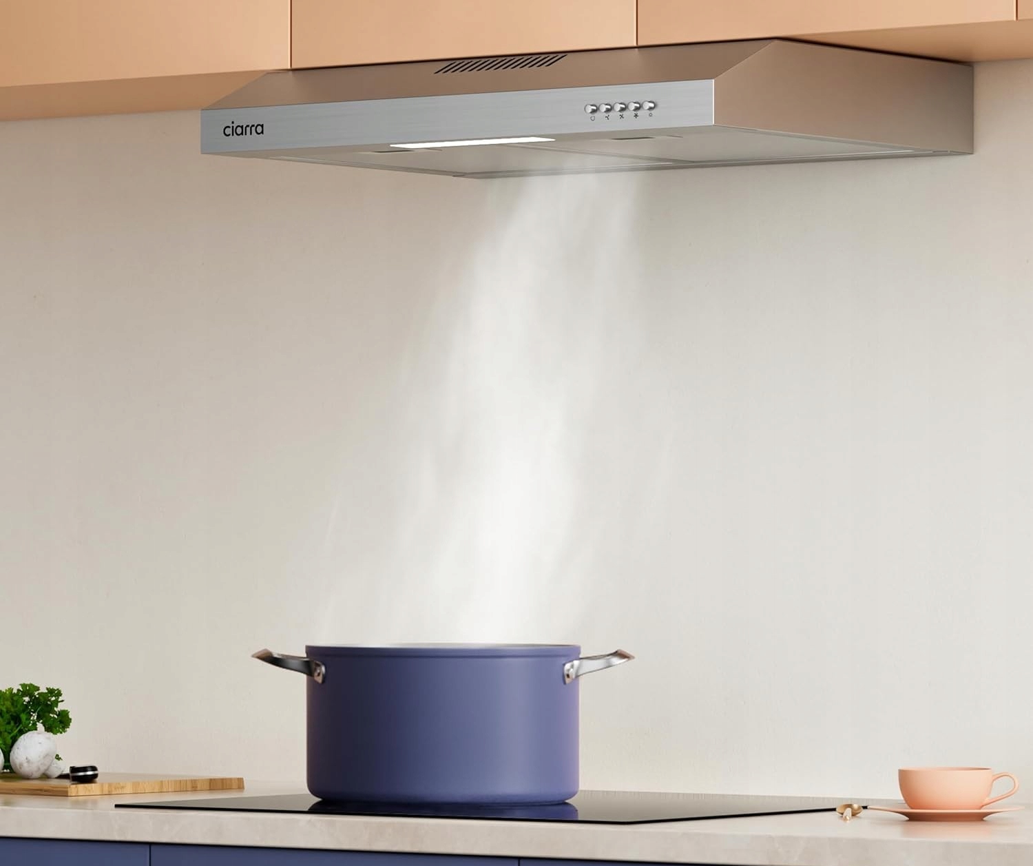Okap CIARRA AWS6903D zapewnia skuteczne oczyszczanie powietrza dzięki mocy ssania 220 m³/h, eliminując parę, zapachy i opary tłuszczu w kilka chwil.