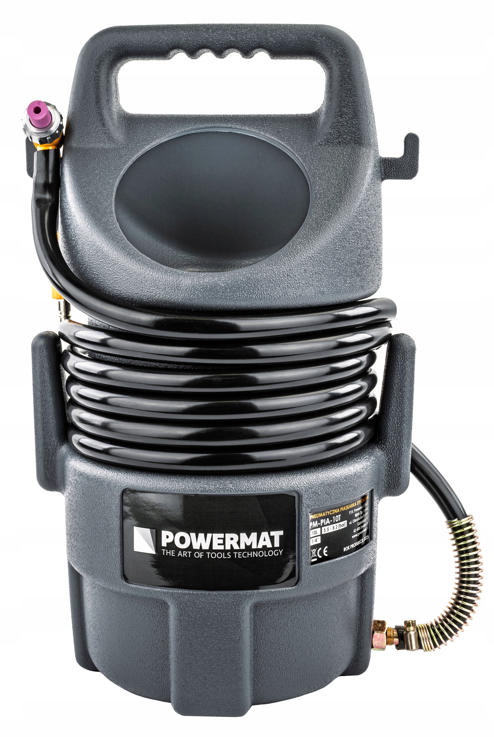 Solidny zbiornik o pojemności 10 litrów wykonany z trwałych materiałów wyposażono w uchwyt transportowy oraz złącze pneumatyczne dla wygody użytkowania i mobilności.