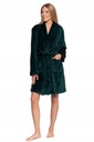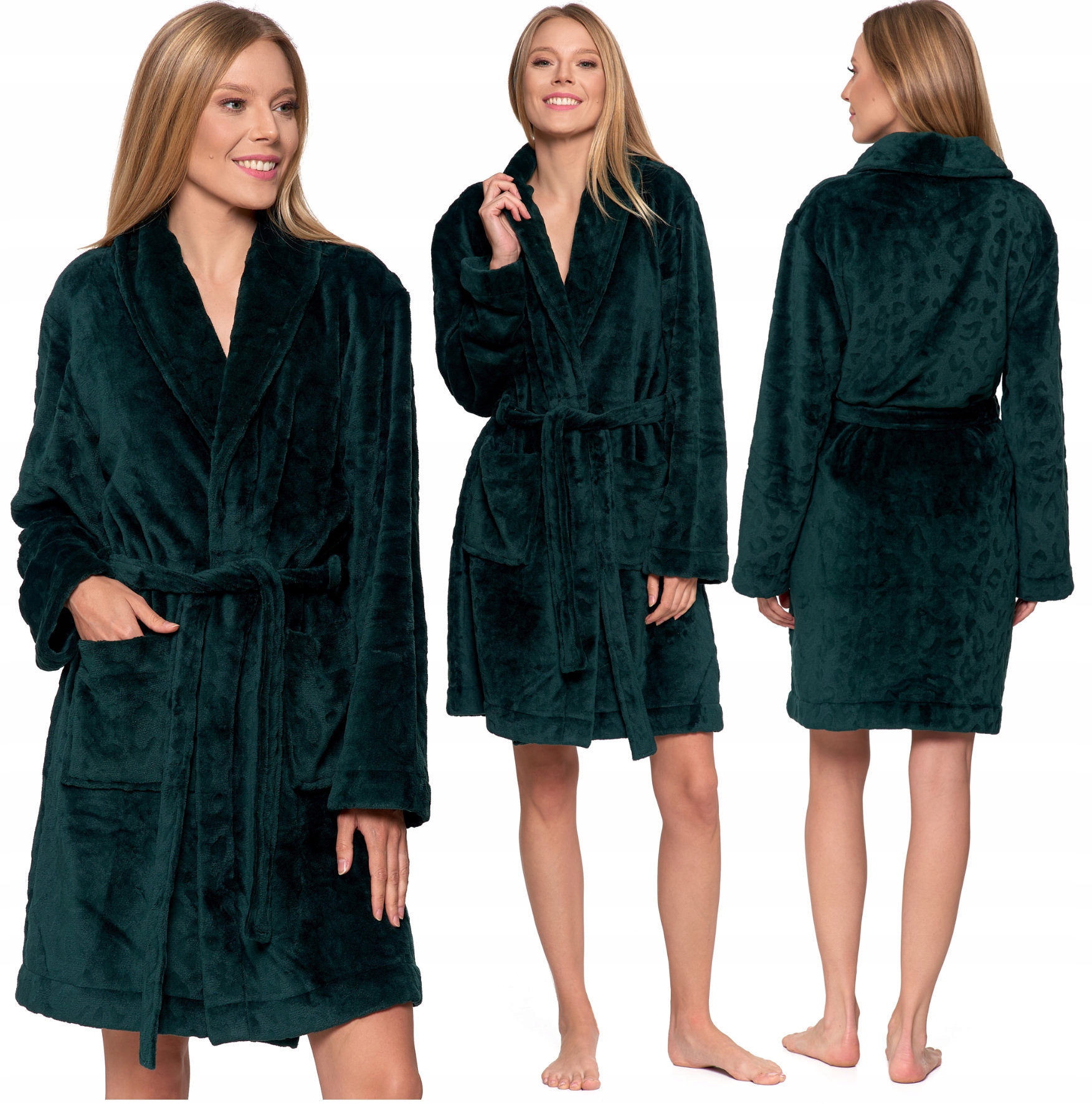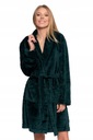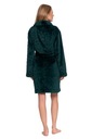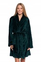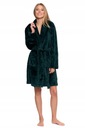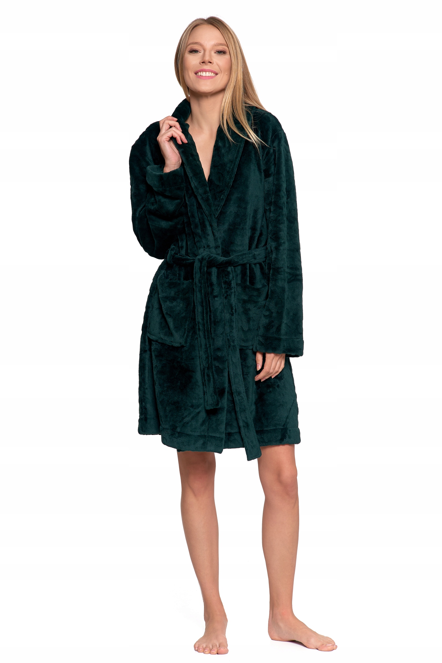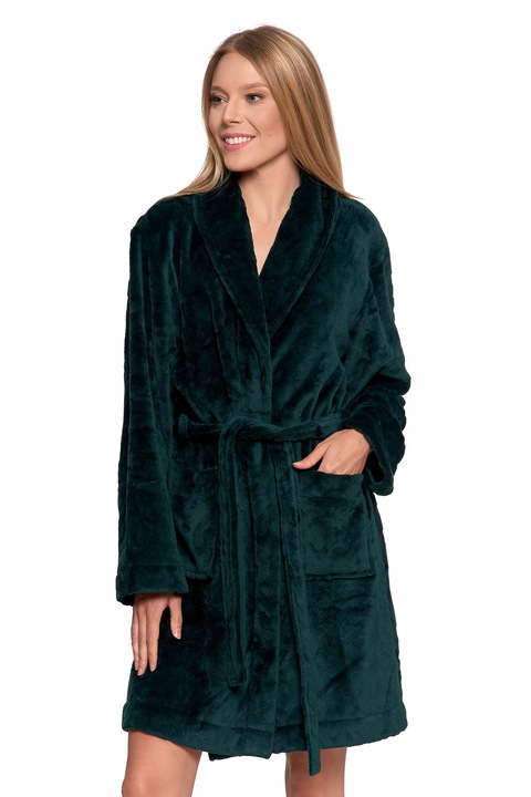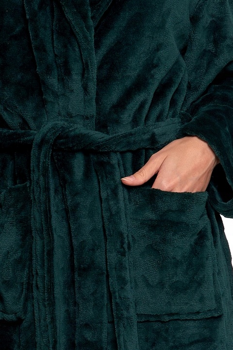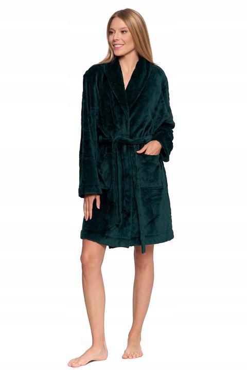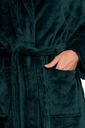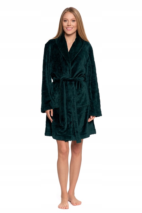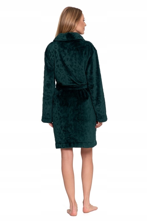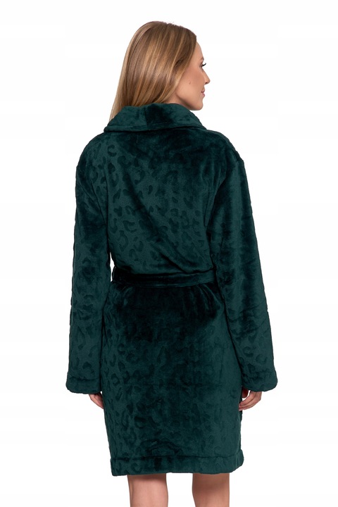 Szlafrok wyróżnia się wzorem w cętki w głębokim, odcieniu butelkowej zieleni. Posiada wysoką stójkę oraz praktyczny pasek do wiązania w talii i kieszenie, dzięki czemu możesz idealnie dopasować go do swojej sylwetki. To idealny wybór, by poczuć się stylowo i ciepło!