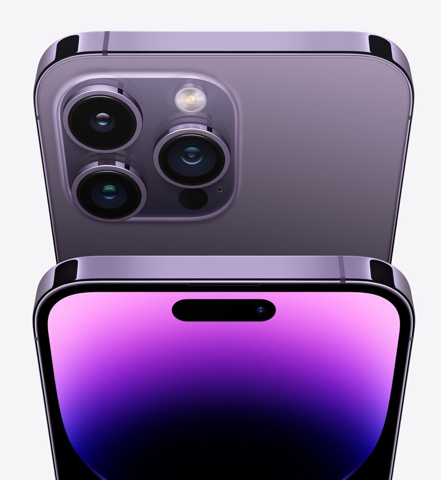 iPhone 14 Pro 1TB Fioletowy wygląda z tyłu tak samo jak jego poprzednik, czyli iPhone 13 Pro, ale przód został odmieniony. Wcięcie, które w zeszłym roku znajdowało się u góry ekranu jest teraz mniejsze i nieco bardziej owalne, tworząc tak zwaną "Dynamiczną Wyspę".