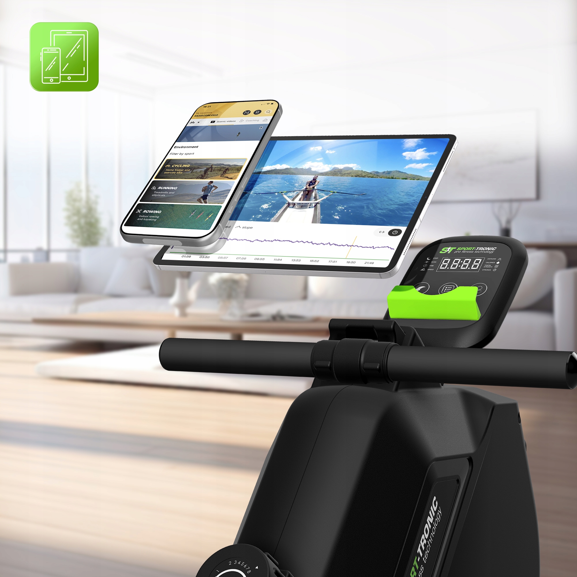 To nie wszystko! Funkcja 2-w-1 łączy monitor z bezpiecznym uchwytem na tablet lub smartfon. Możesz urozmaicić swój trening, oglądając ulubiony serial lub zanurzając się w wirtualnych trasach dzięki kompatybilności z aplikacją Kinomap.