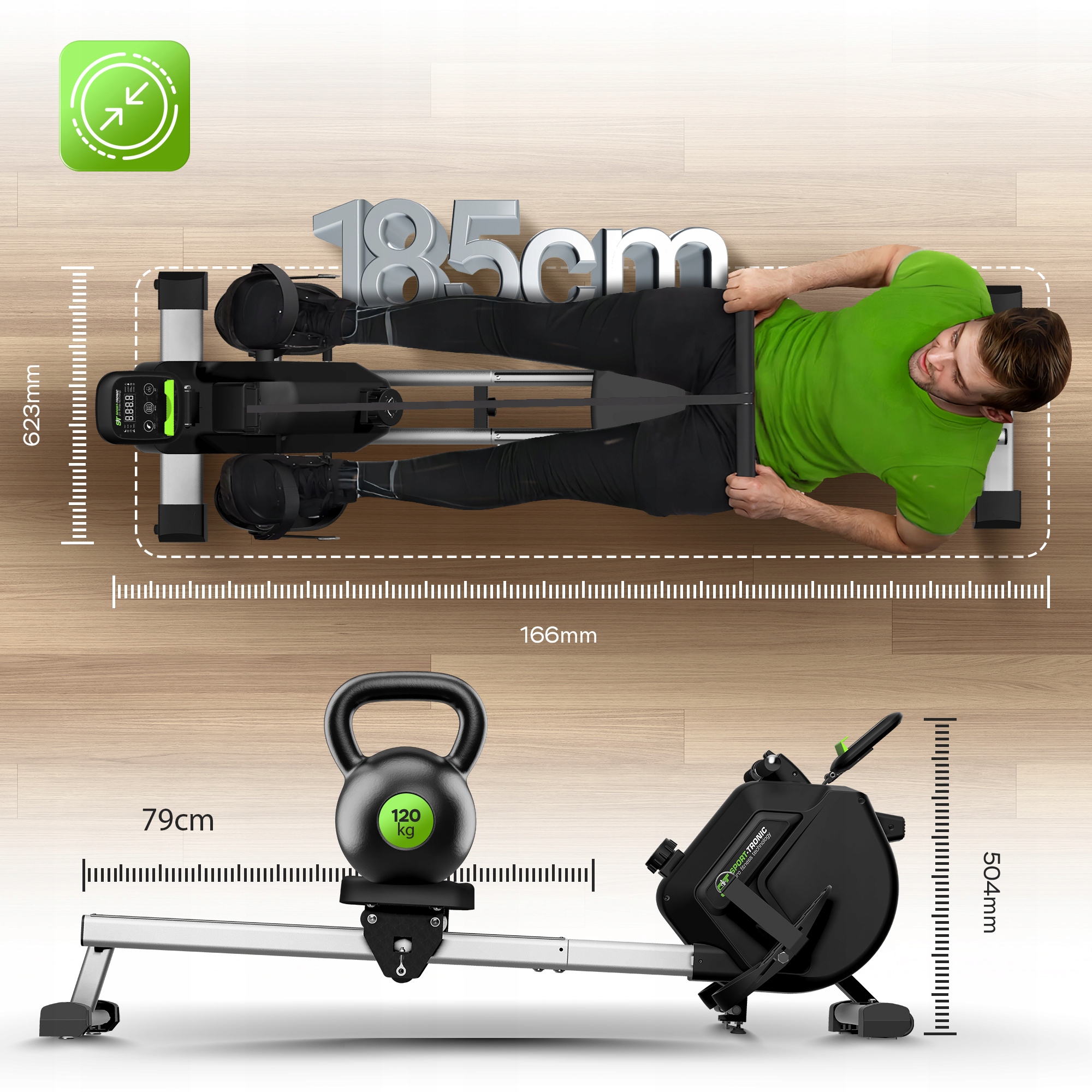 Wioślarz został zaprojektowany, aby połączyć maksymalną wytrzymałość z oszczędnością miejsca. Solidna, stabilna rama gwarantuje bezpieczeństwo i wytrzymuje obciążenie użytkownika aż do 120 kg.