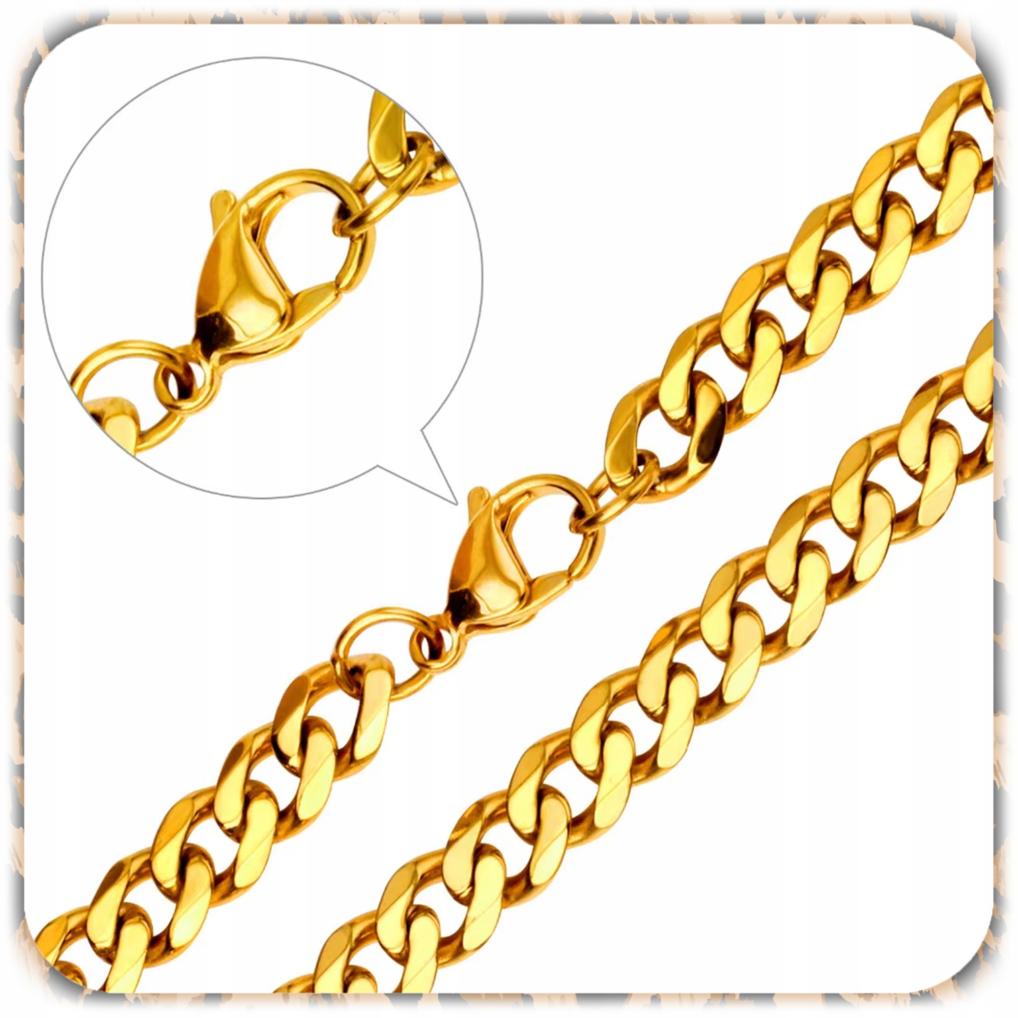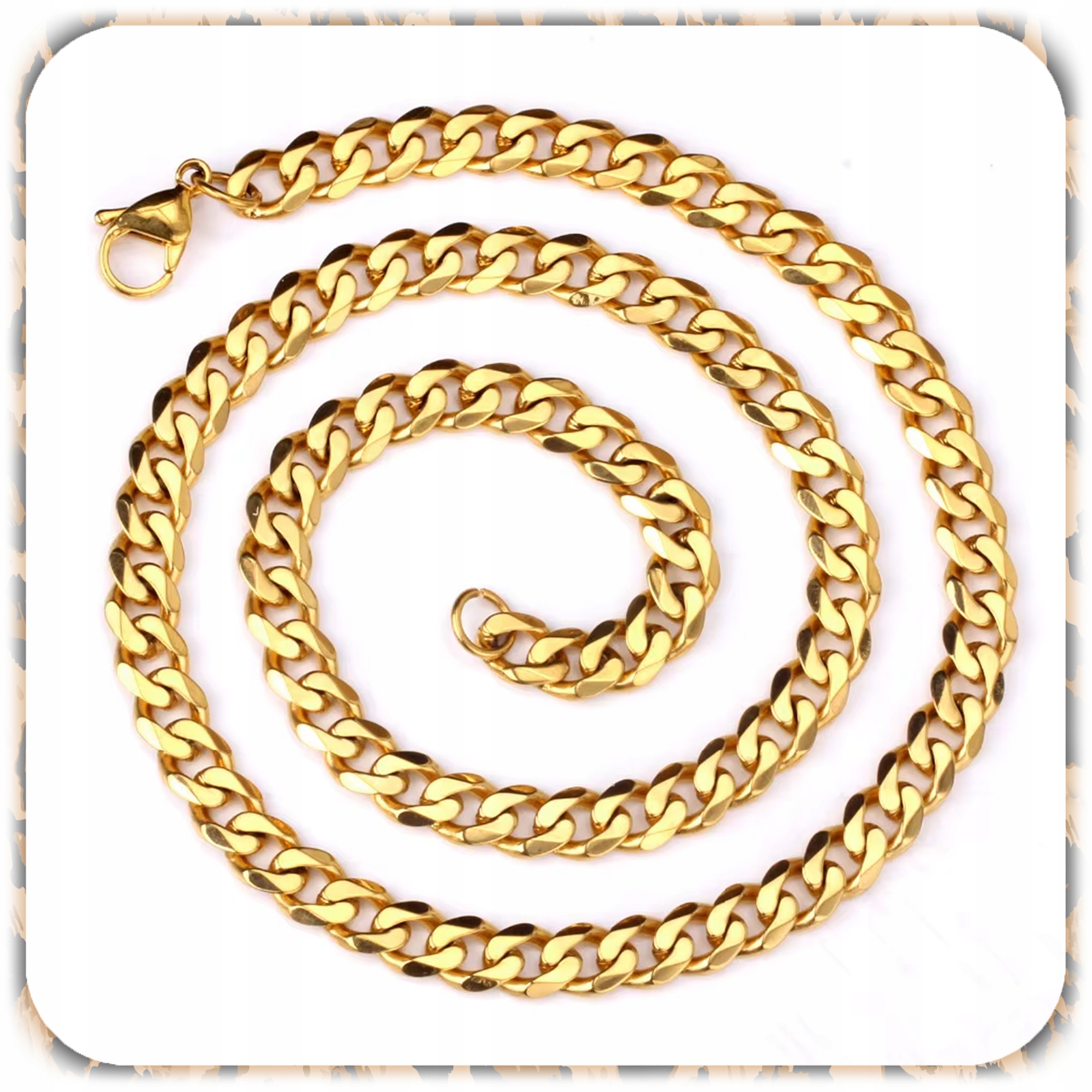 ✔️ Złoty łańcuch – długość ok. 80 cm (40 cm po zapięciu), szeroki, błyszczący, z solidnym karabińczykiem.