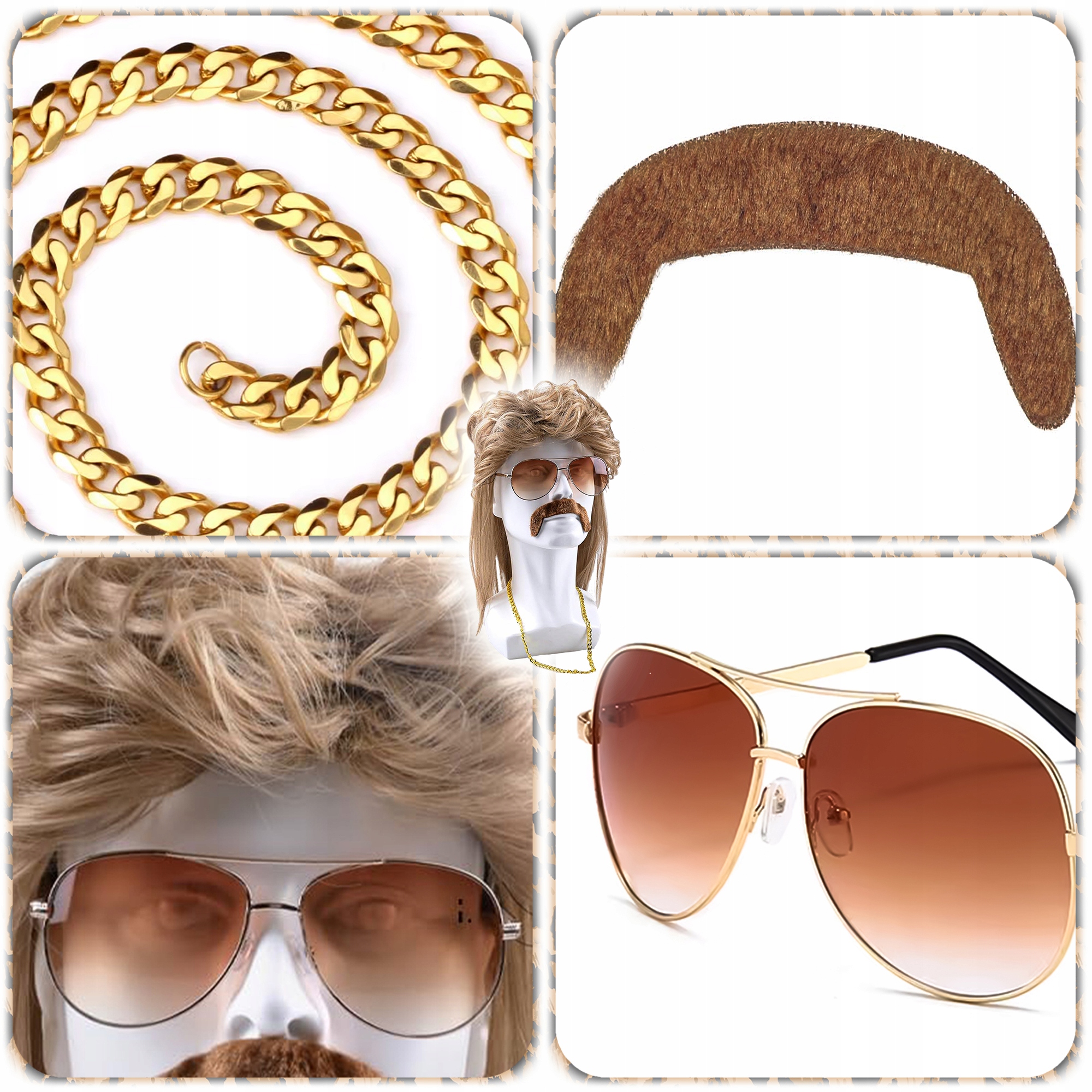 Kultowy styl „Vokuhila” (przód krótki, tył długi) to symbol lat 80. – czasów, gdy liczył się luz, muzyka i charakter. W połączeniu z dużymi okularami „pilotkami”, złotym łańcuchem i imponującymi wąsami, ten zestaw tworzy niepowtarzalny look, który przeniesie Cię prosto w czasy rockowych scen i dyskotekowego szału.