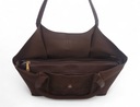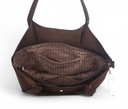 Spód torebki oraz rączki wykonane z eko skóry. W środku duża, zamontowana na stałe kosmetyczka zamykana na suwak, oraz dwie duże komory po jej bokach Całość zapinana jeszcze paseczkiem na magnes.