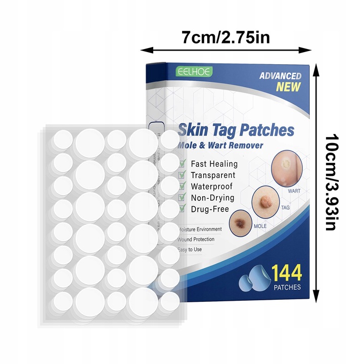 ⏺ Sposób użycia: Oczyść obszar tagu skóry i pozostaw do wyschnięcia. W razie potrzeby zastosuj tagi skóry. Pozostaw na kilka godzin lub na noc. Po całkowitym wyschnięciu wymień plaster.
