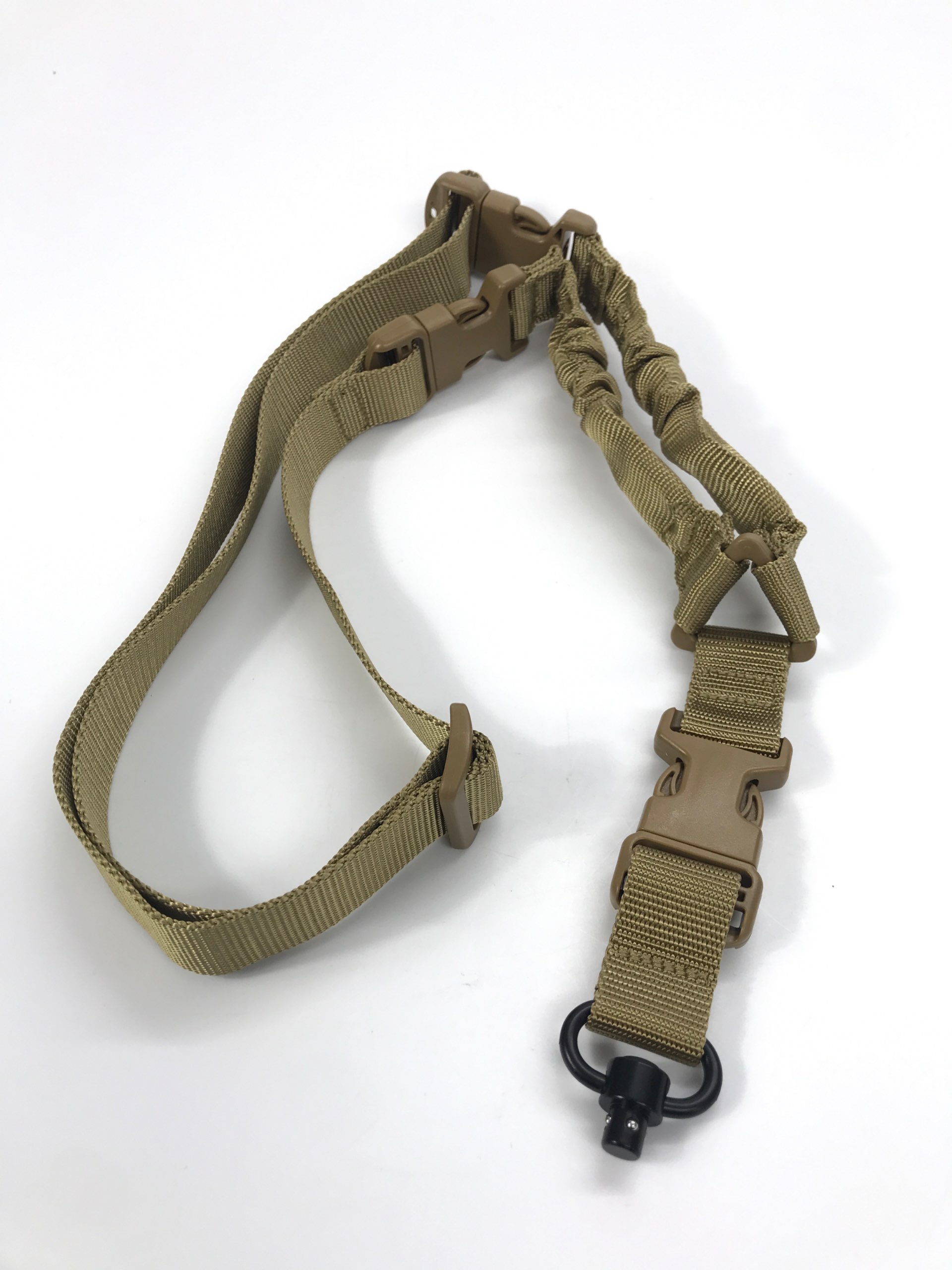 Szybkozłączka pozwala błyskawicznie odpiąć broń, a solidny karabińczyk z systemem obrotowym zapobiega skręcaniu się pasa.