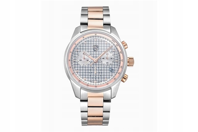 Chronograf z ekskluzywnej kolekcji Pepita wyposażony w analogowy mechanizm kwarcowy, wykonany z drobno szczotkowanej stali nierdzewnej, chronograf zachwyca polerowaną koronką i przyciskami z powłoką w kolorze różowego złota oraz wygrawerowanym herbem Porsche na tarczy. Szkło mineralne z szafirem i powłoką antyrefleksyjną chroni tarczę, na której znajduje się monochromatyczny nadruk 3D wzoru Pepita i herb Porsche. Ponadto wskazówki godzinowe i minutowe pokryte powłoką Superluminova zapewniają optymalną czytelność. Oprócz datownika umieszczonego na godzinie 4, chronograf oferuje trzy liczniki umożliwiające kompleksowy pomiar czasu: licznik sekund (godzina 3), chronograf 30-minutowy (godzina 9), chronograf godzinowy (godzina 6). Zapięcie motylkowe – ozdobione wygrawerowanym napisem Porsche – oraz napis „ Made in Germany” na godzinie 6 dopełniają ekskluzywnego wyglądu. W skrócie: dopracowane detale oraz idealne połączenie formy i funkcjonalności sprawiają, że chronograf Pepita to prawdziwy must-have dla wszystkich fanów wyścigów.