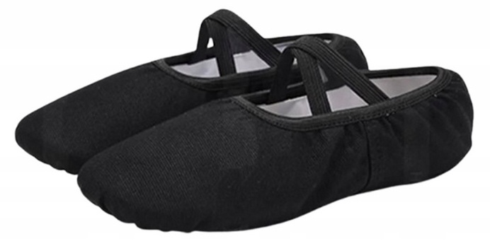 Baletki gimnastyczne z gęsto plecionej bawełny z podeszwą wzmacnianą skórą. Dodatkowe wzmocnienia na pięcie, śródstopiu i palcach. Sznureczki pozwalają dopasować baletki do stopy, a gumy ściągające zapobiega spadaniu obuwia podczas tańca. Chronią nogi przed urazami w czasie treningów tańca oraz gimnastyki.