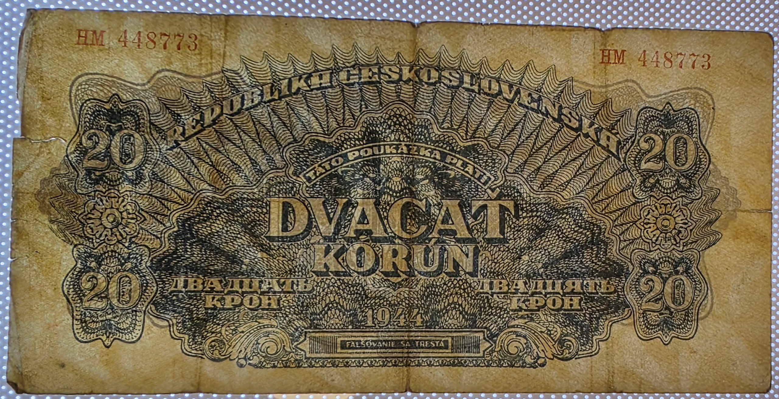 Oryginalny banknot o nominale 20 koron, wydany w 1944 roku przez Republikę Czechosłowacką (Republika Československá), w ostatnim okresie II wojny światowej.