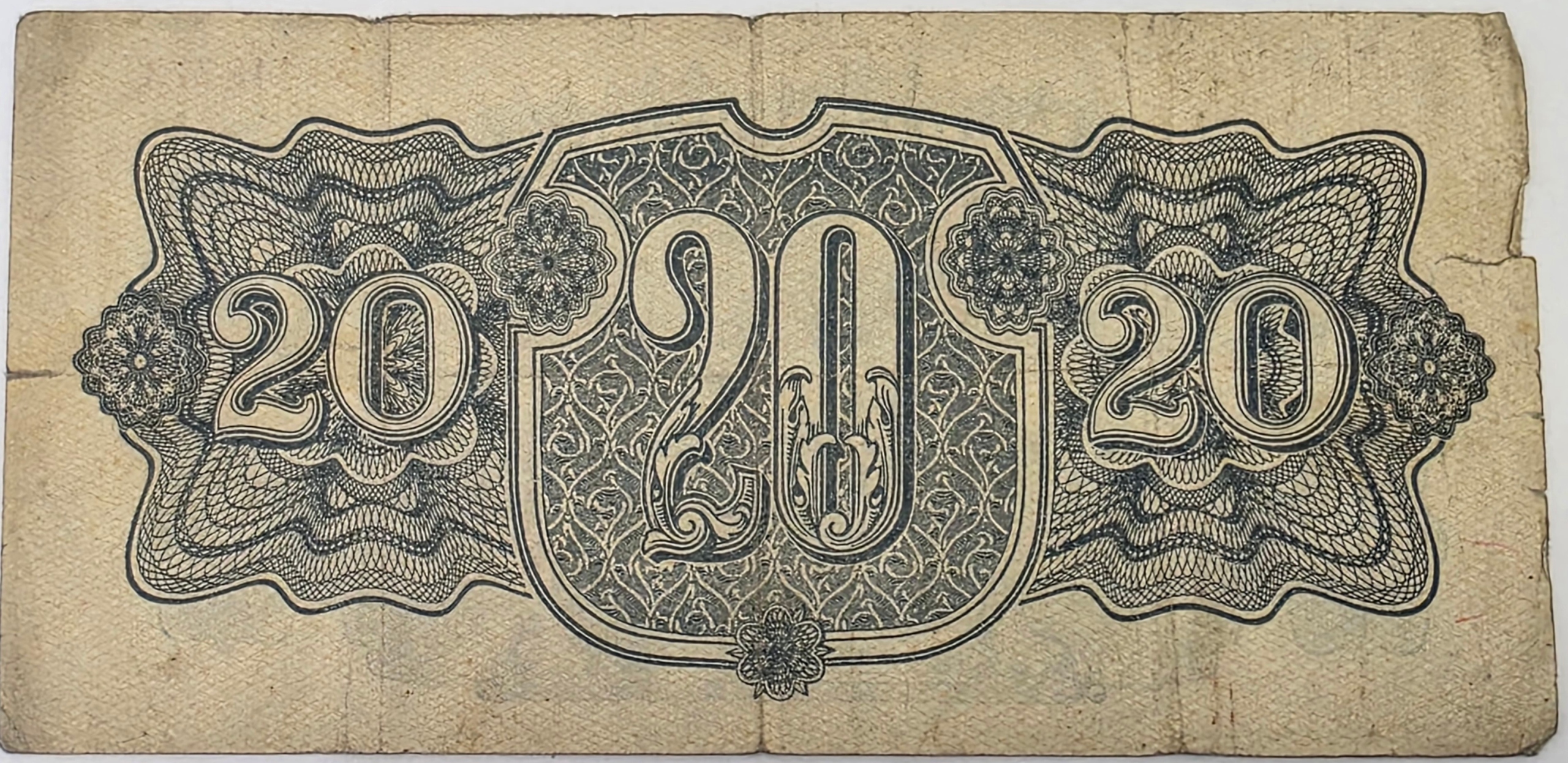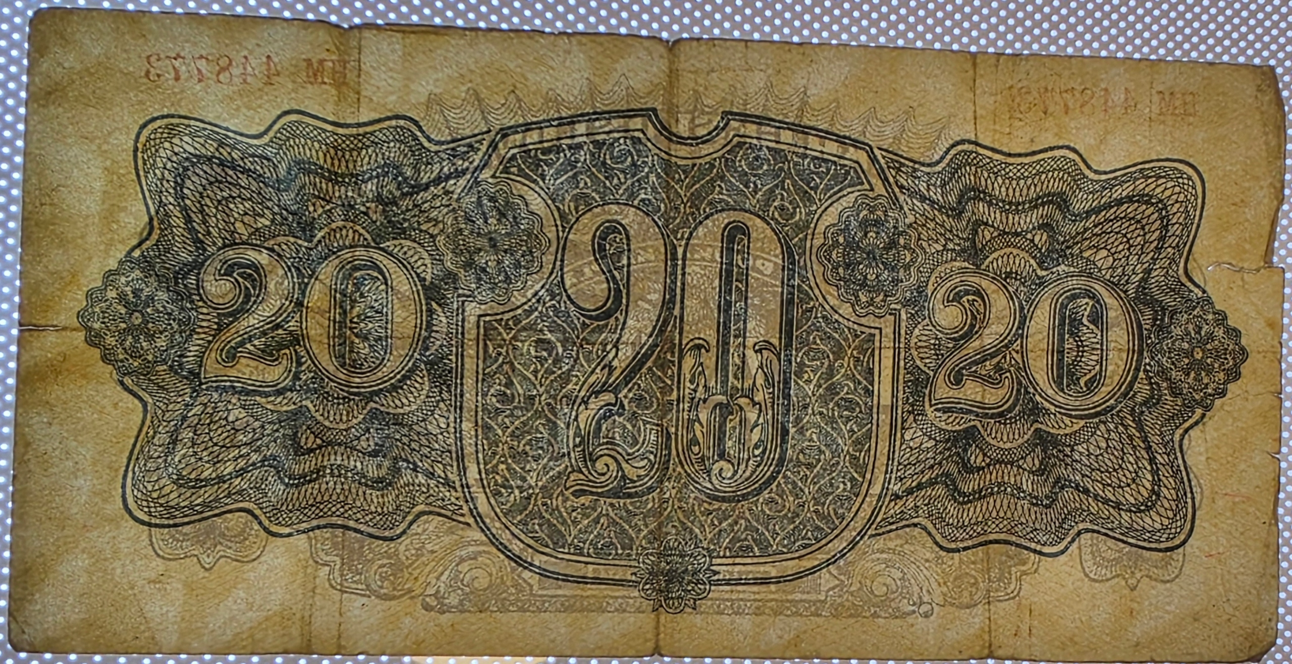 duży, artystyczny gilosz z centralnym nominałem 20 powtórzonym trzykrotnie