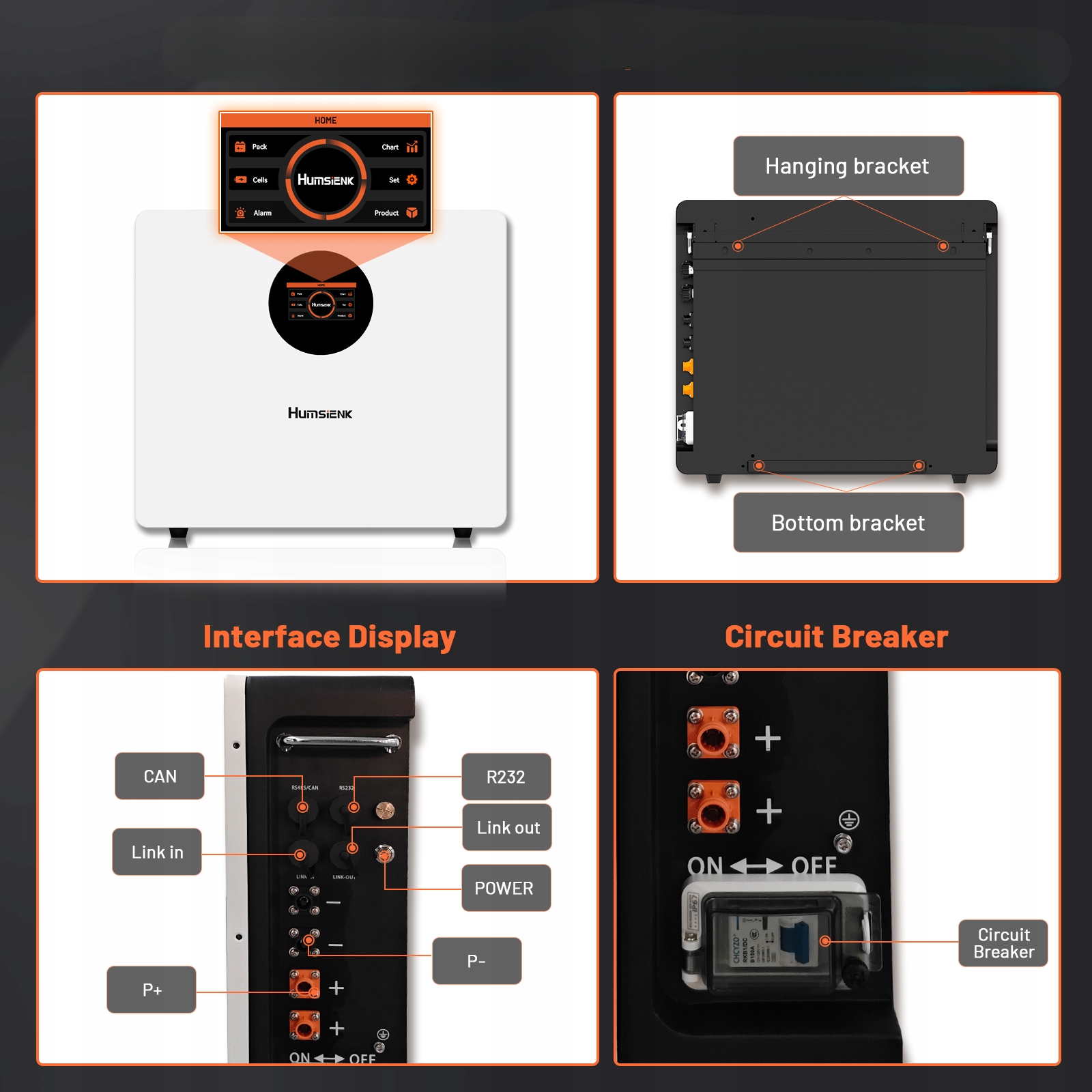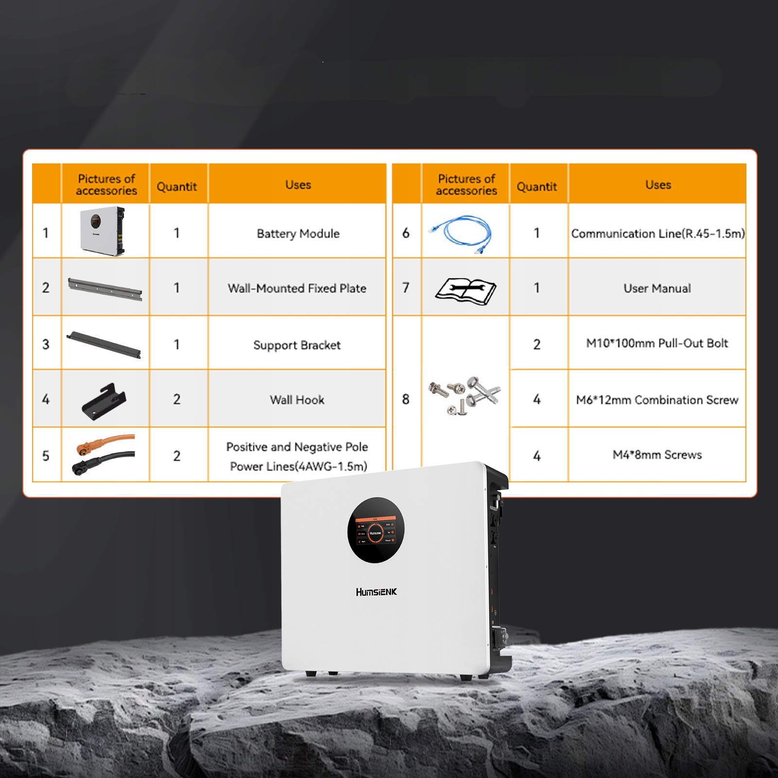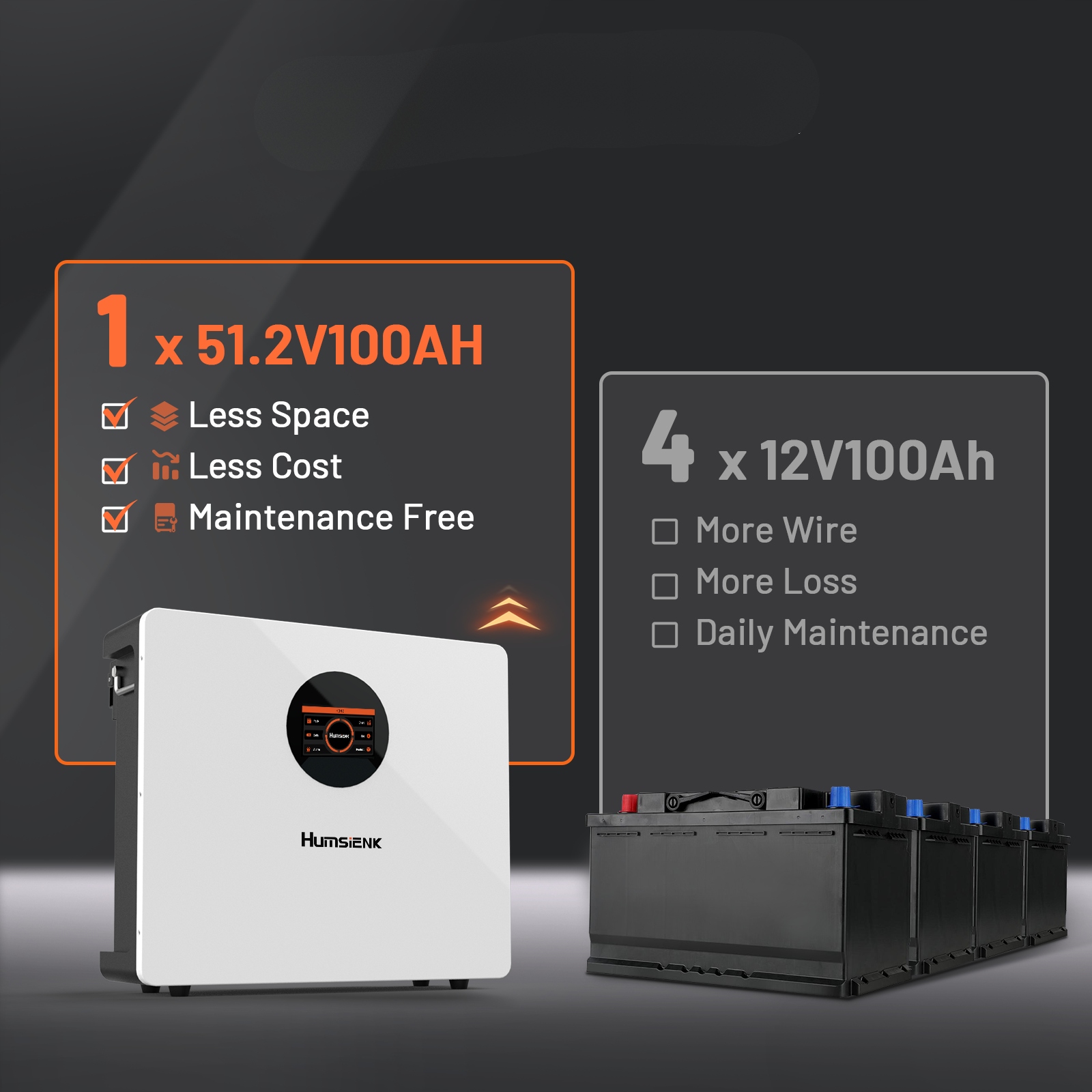 Humsienk 48V (51.2V) 100Ah LiFePO₄ to nowoczesny magazyn energii 5kWh, zaprojektowany z myślą o domowych i biurowych systemach zasilania. Dzięki konstrukcji ściennej zajmuje nawet 30% mniej miejsca niż tradycyjne akumulatory kwasowo-ołowiowe, a jego montaż jest szybki i bezproblemowy – plug & play.