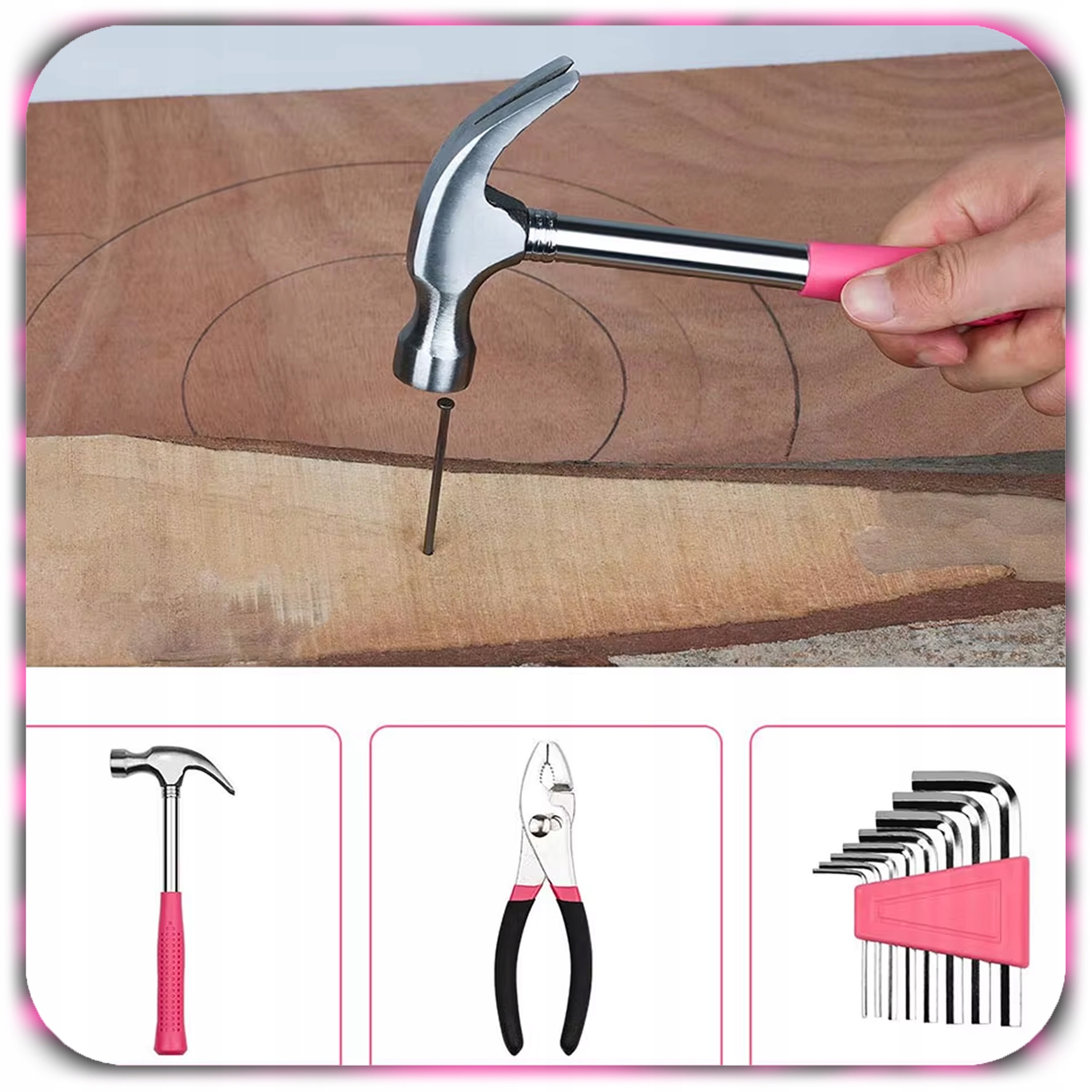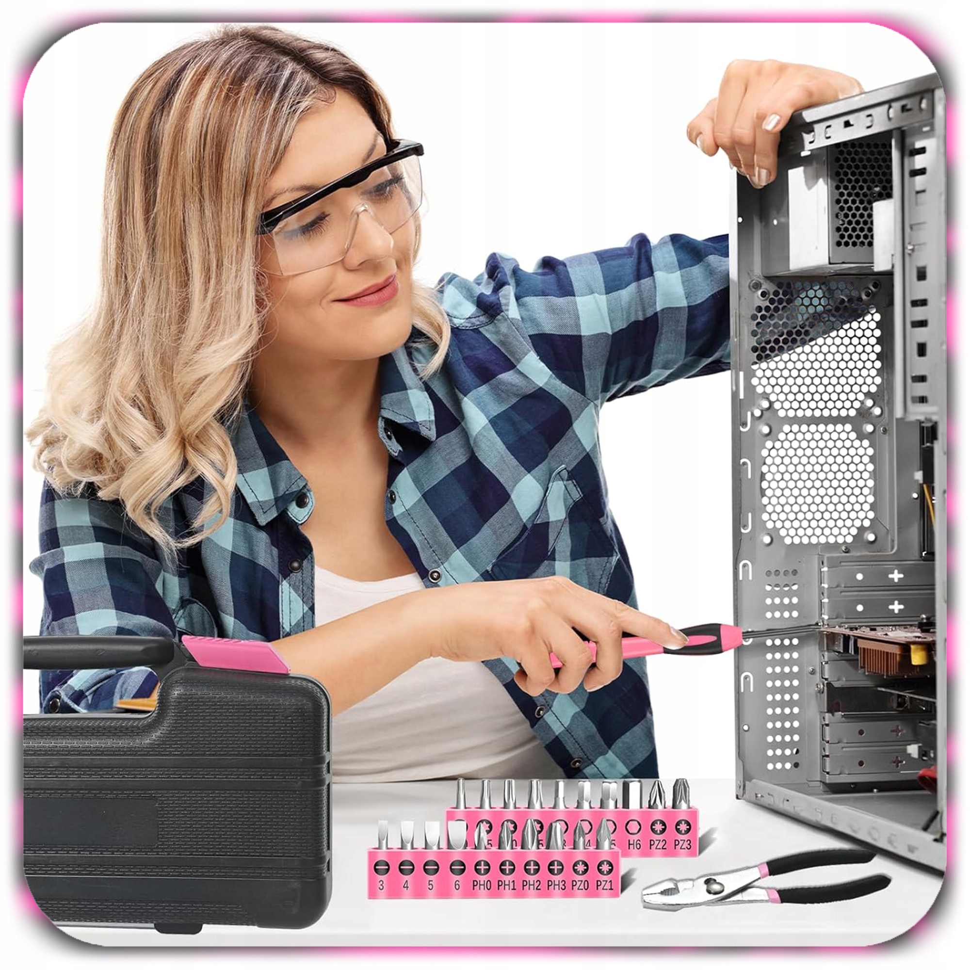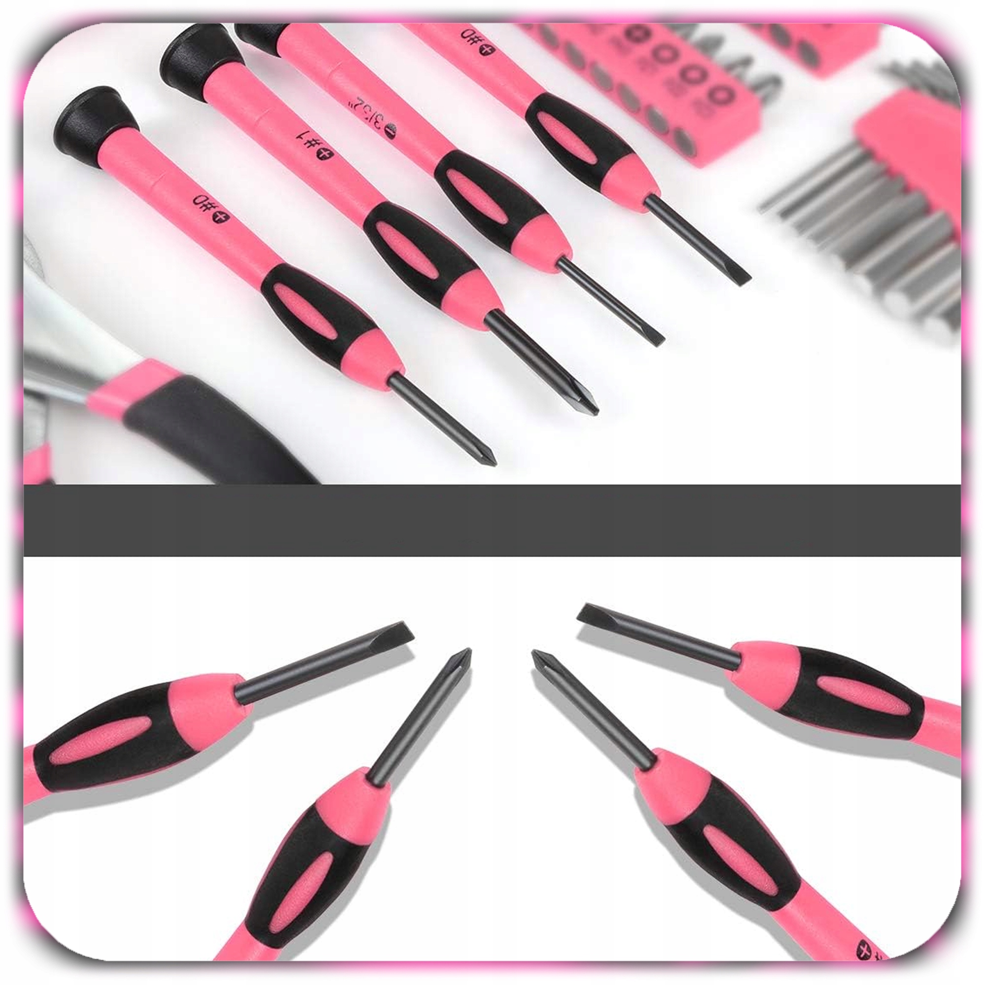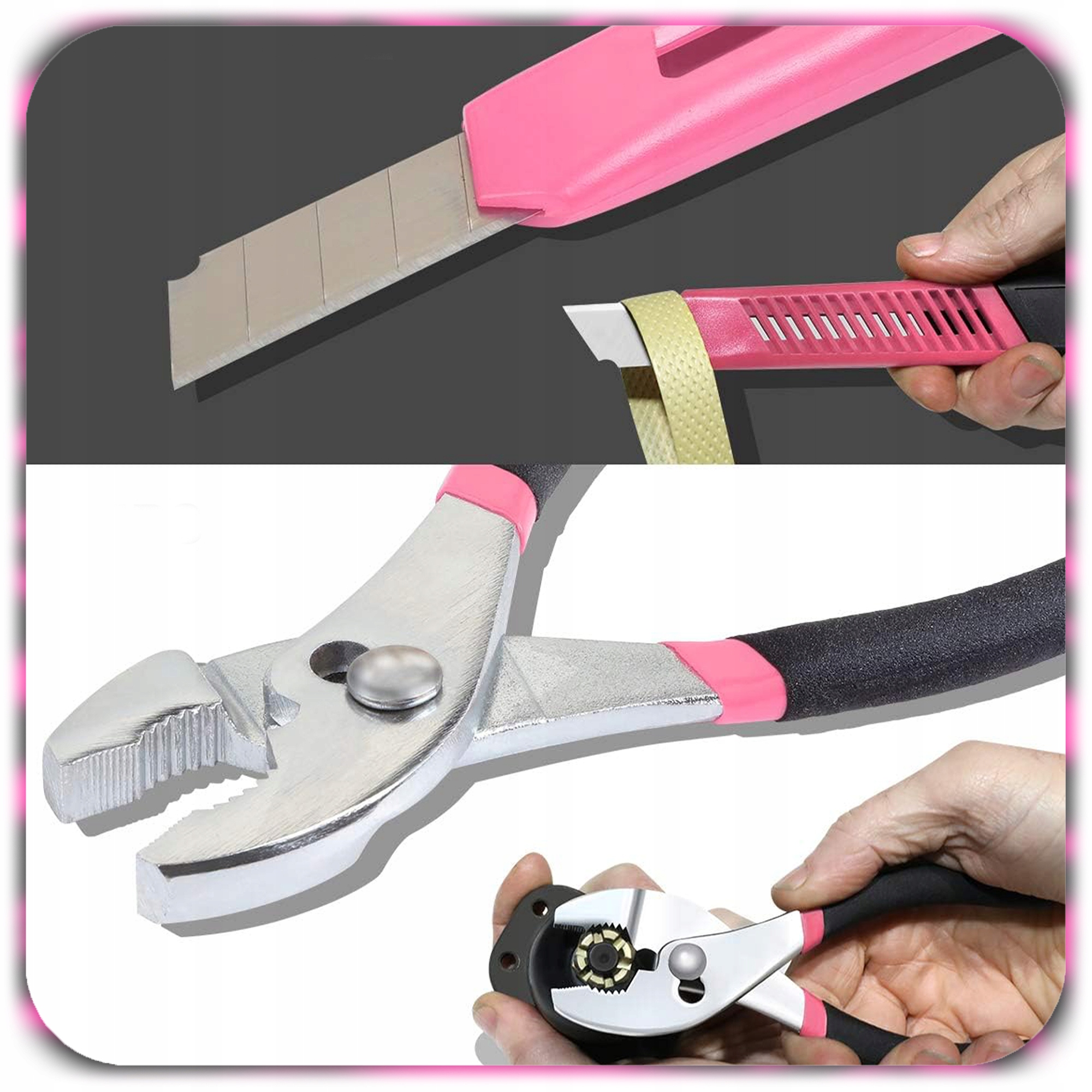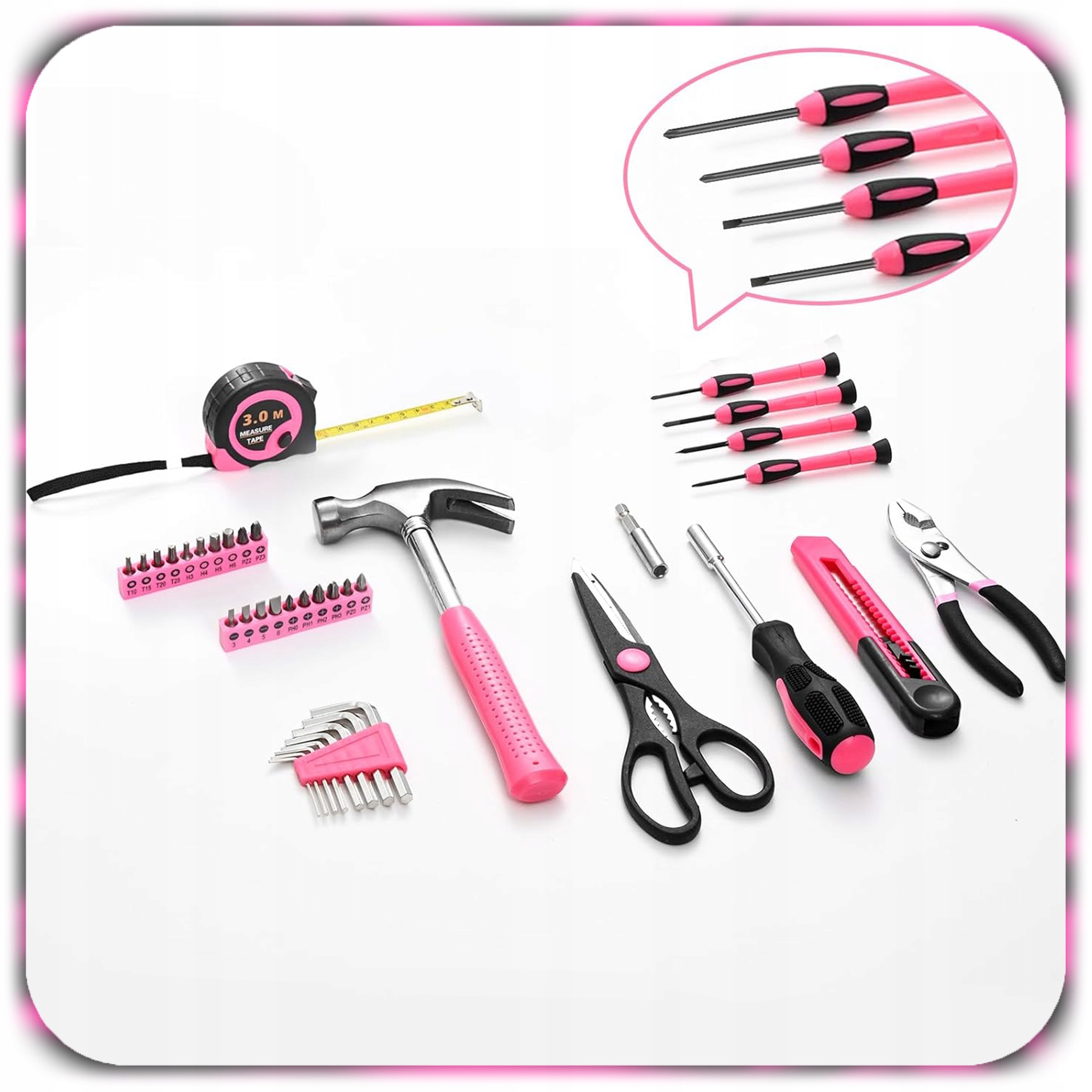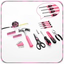 Stylowy różowo-czarny design wyróżnia się spośród klasycznych zestawów narzędzi.
