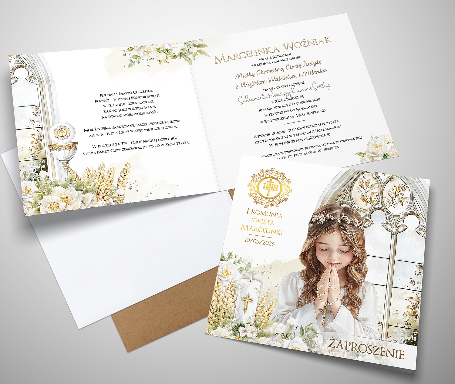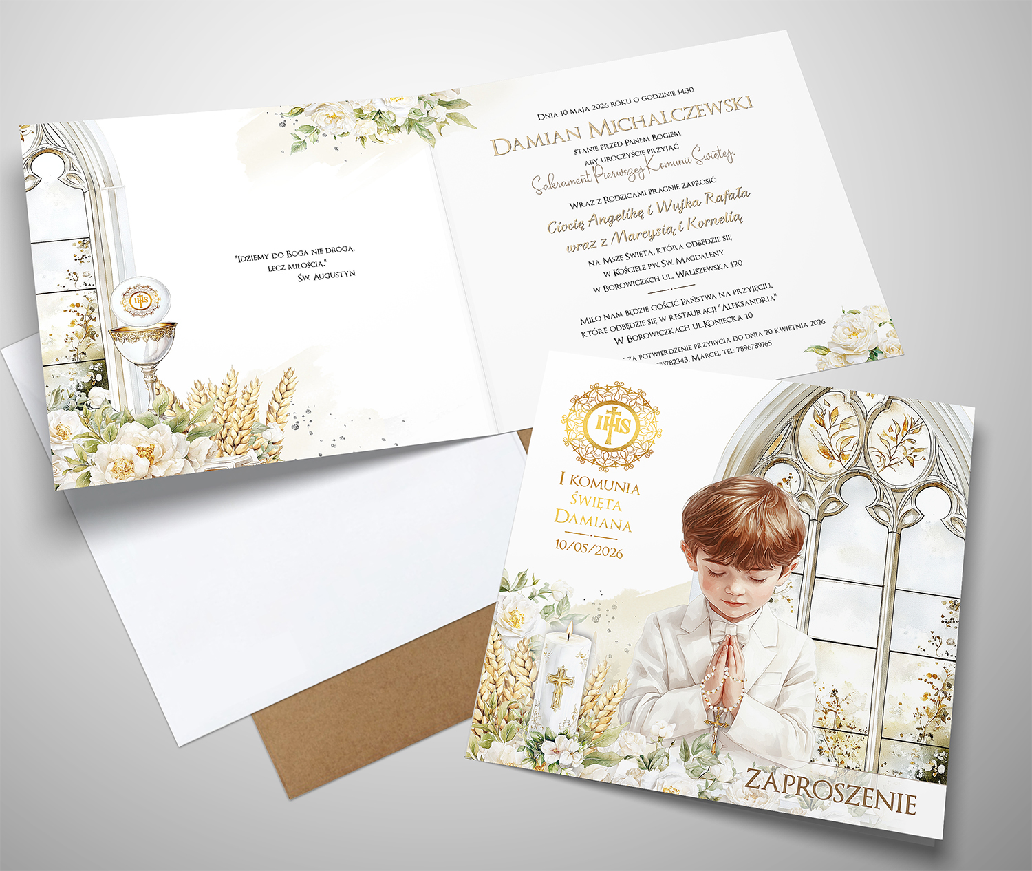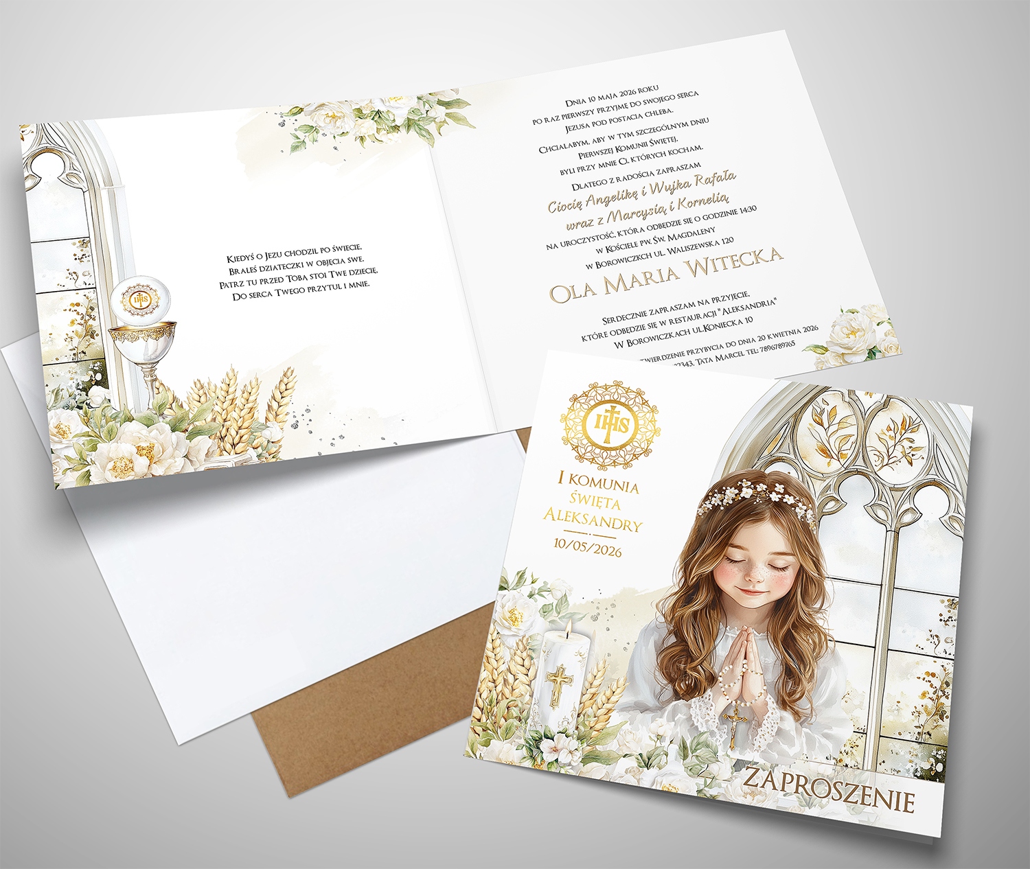 - na przodzie zaproszenia złocona hostia, imię i data komuniii.
