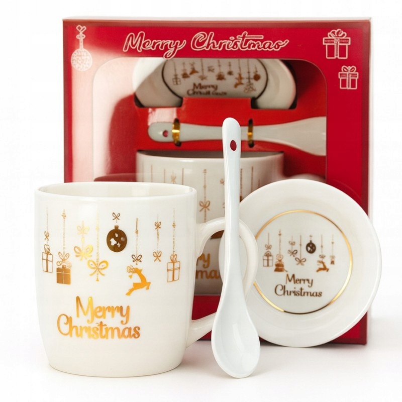 KUBEK CERAMICZNY z motywem świątecznym Zestaw z pokrywką i łyżeczką Idealny gadżet dla każdego miłośnika kawy czy herbaty. Specyfikacja: Materiał: ceramika / stal nierdzewna Kolor: biały, złoty Pojemność: max 350 ml Wymiary: 8,5 cm x 9 cm Średnica pokrywki: 9,5 cm Długość łyżeczki: 13 cm Czyszczenie: Produkt przeznaczony do ręcznego mycia Wymiary opakowania: 18cm x 16,5cm x 10 cm Waga: 363 g netto 463 g brutto Zestaw zapakowany w ozdobne kartonowe pudełko Poczuj świąteczny klimat!