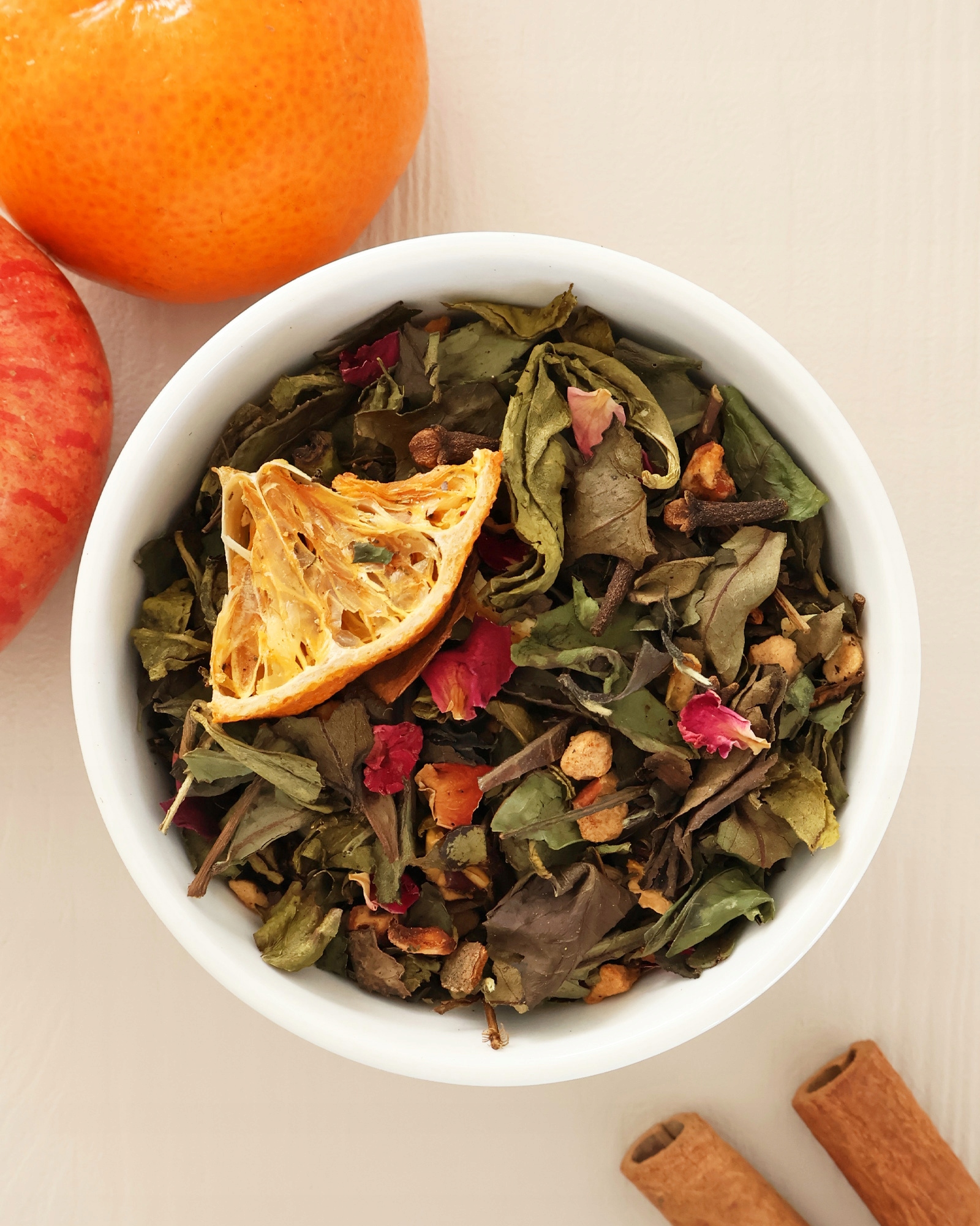✅ herbata biała Pai Mu Tan, suszone jabłko, suszona mandarynka, kora cynamonu, suszona skórka cytryny, goździki, aromaty, płatki róży.