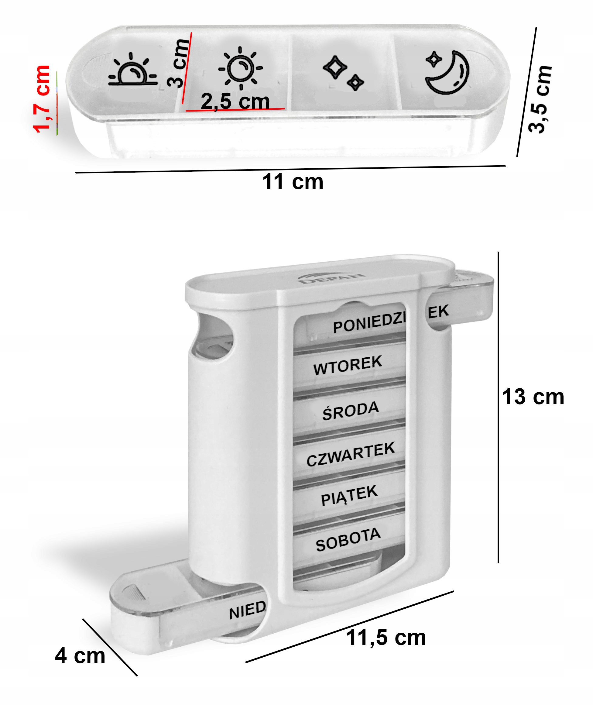 ✅Kasetka dzienna posiada opis GRAFICZNY każdej przegrody dnia.