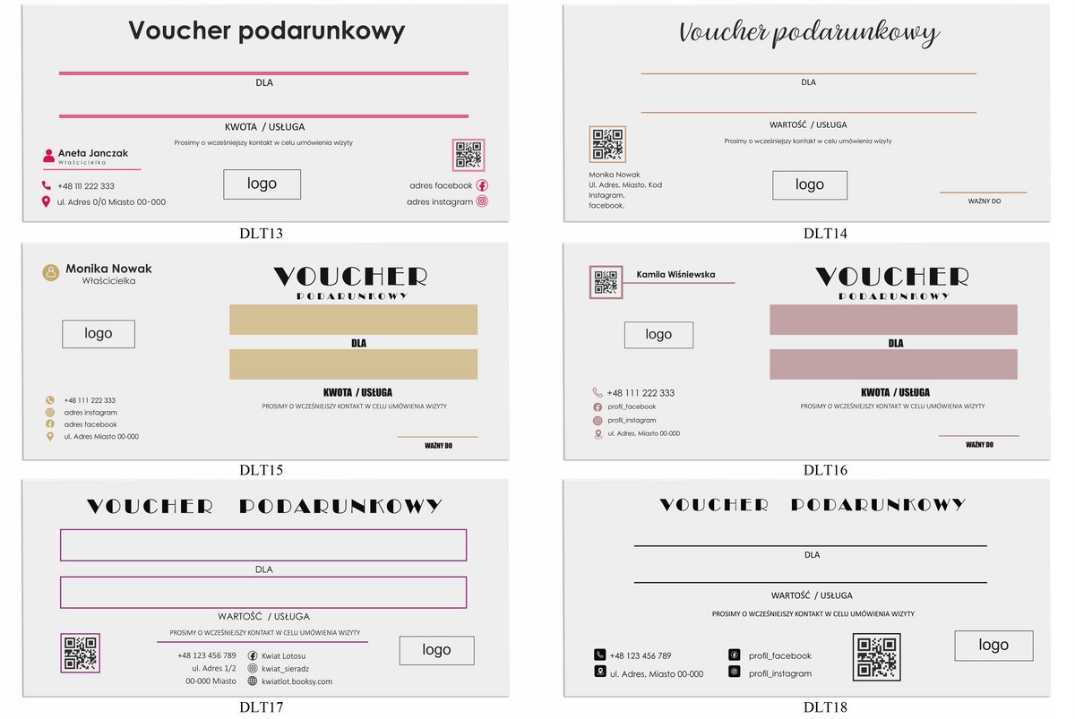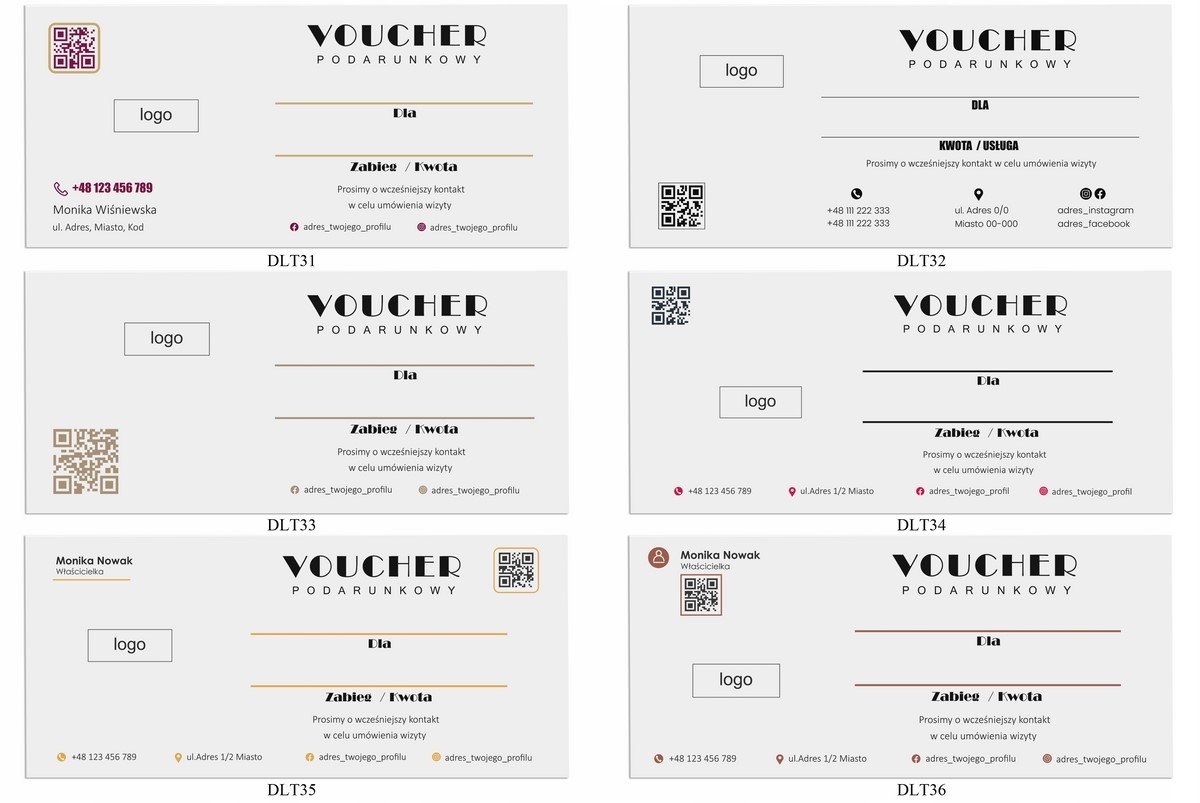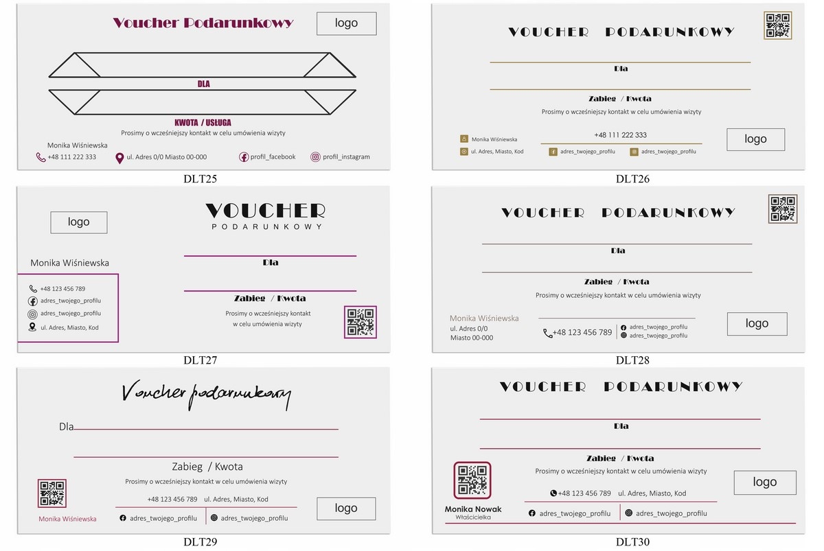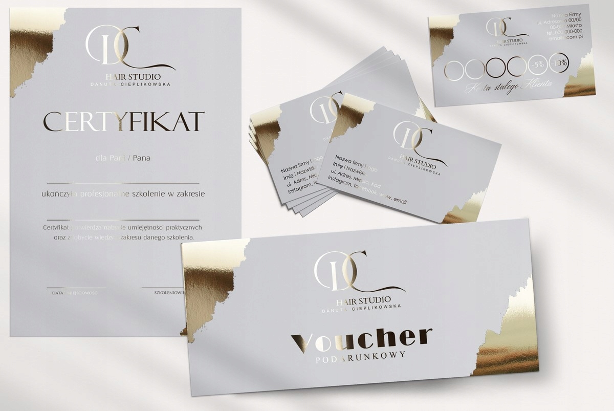 dostępne są wizytówki firmowe, certyfikaty, terminarze, karty stałego klienta w nawiązaniu stylistycznym do vouchera