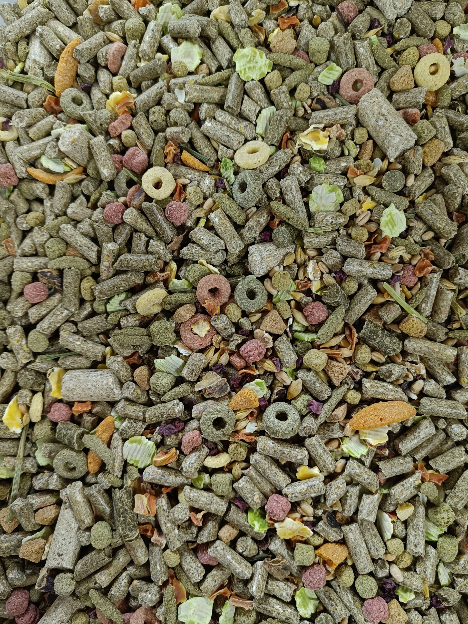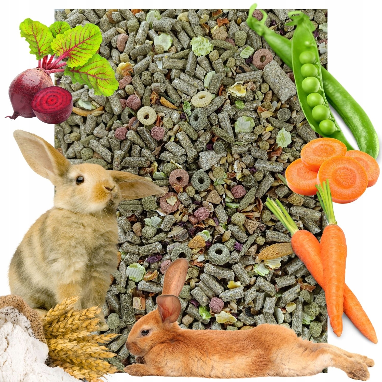 Karma pełnoporcjowa dla królików, odpowiednio zbilansowana, zapewnia dostęp do szerokiej gamy składników pokarmowych.