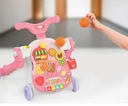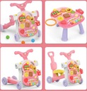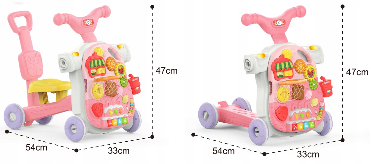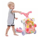 Nasz interaktywny produkt łączy wiele funkcji takich jak: chodzik, pchacz, stolik edukacyjny, zdejmowany panel główny (np. do zawieszenia przy łóżeczku czy oddzielnej zabawy), jeździk, hulajnoga i wiele innych. Produkt przeznaczony dla maluszków już od 12 miesiąca życia. Pchacz jest bardzo pomocny w nauce samodzielnego chodzenia.