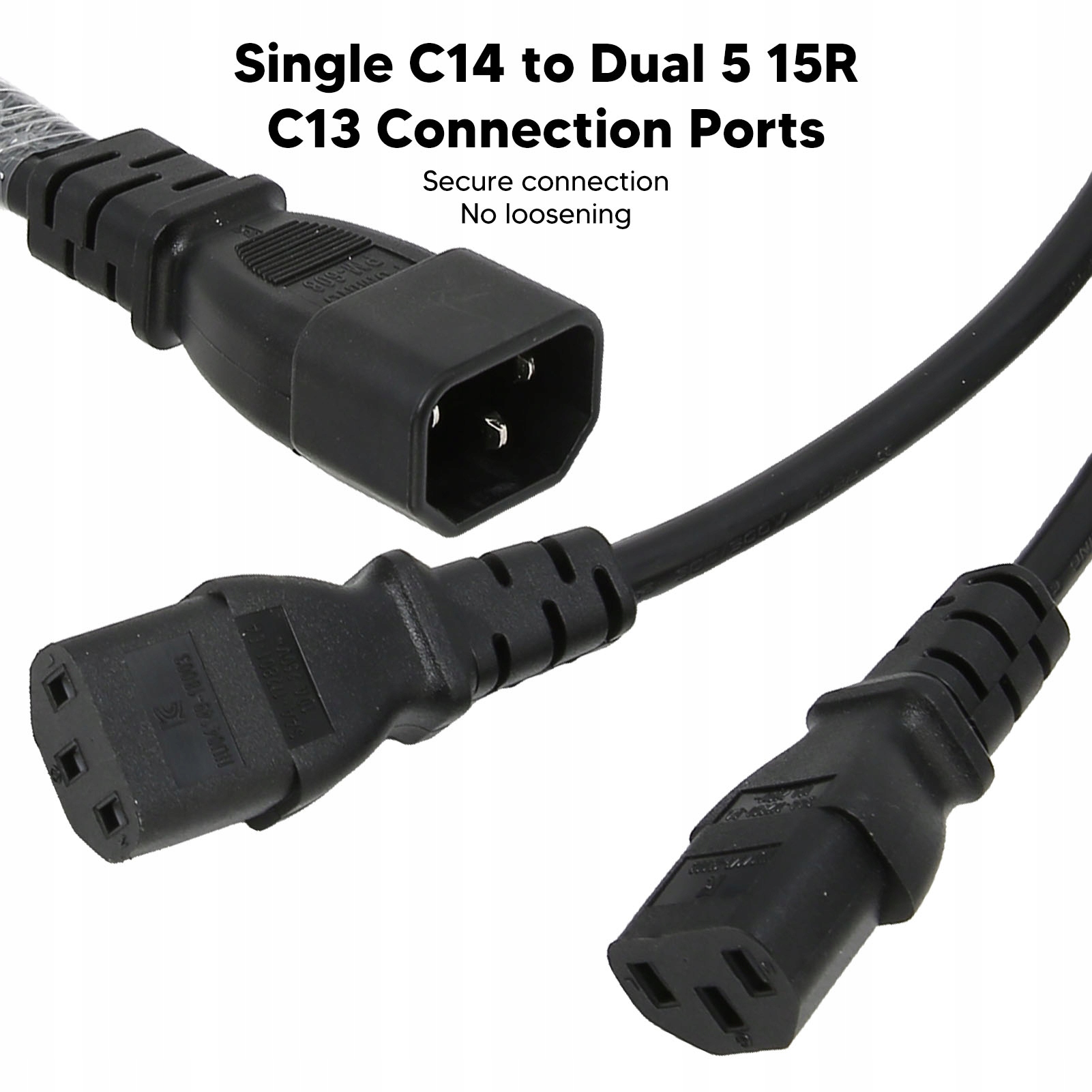 1. TYP ZŁĄCZA: Przewód zasilacza Y ze standardowym pojedynczym portem C14 na dwa porty połączeniowe 5 15R C13, aby zapewnić bezpieczne połączenie i niełatwe do poluzowania.