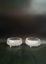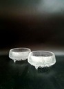 Zestaw 2 szklanych, bezbarwnych małych misek Ultima Thule projektu Tapio Wirkkala z końca lat 60 dla Iittala. Klasyka fińskiego designu. Na żywo robią jeszcze większe wrażenie, ponieważ zewnętrze wygląda jak lodowe ściany, które topnieją, a krople spływają na podstawę, tworząc także nóżki. Linia ta obejmowała różnorodne typy naczyń od karafki ze szklankami, talerze po miski. Tutaj zestaw 2 małych miseczek, doskonałych na przekąski, tapas, etc.