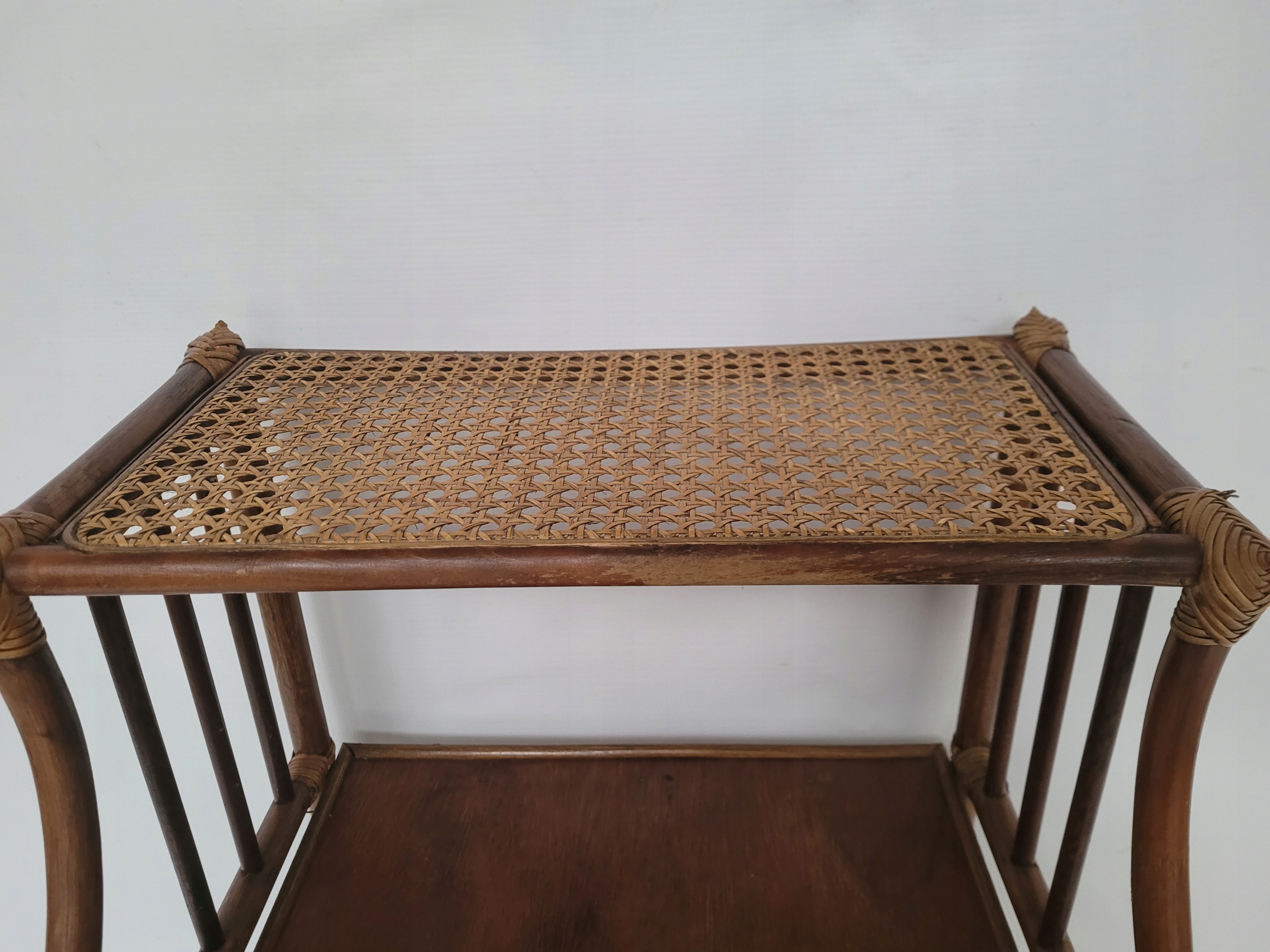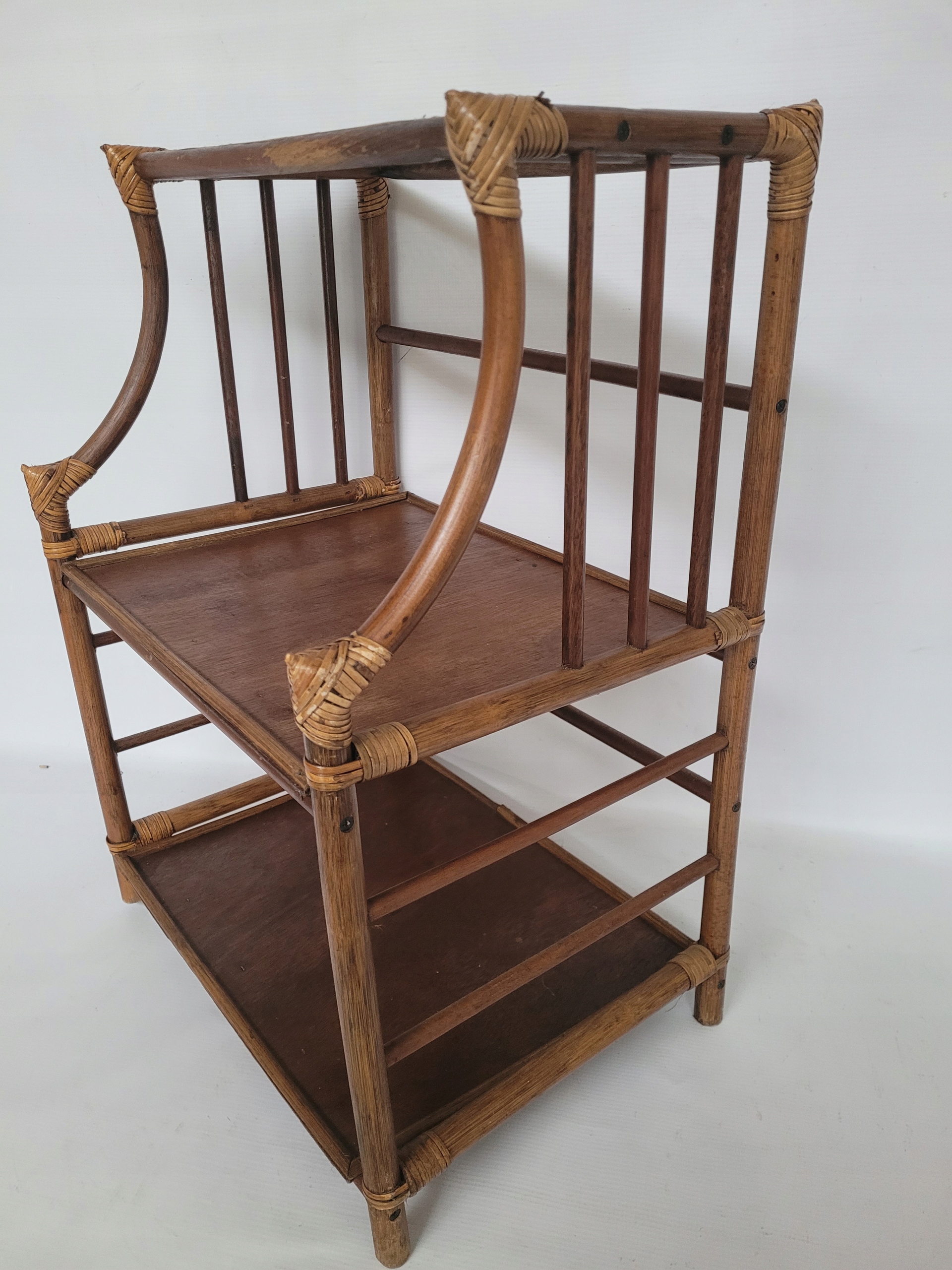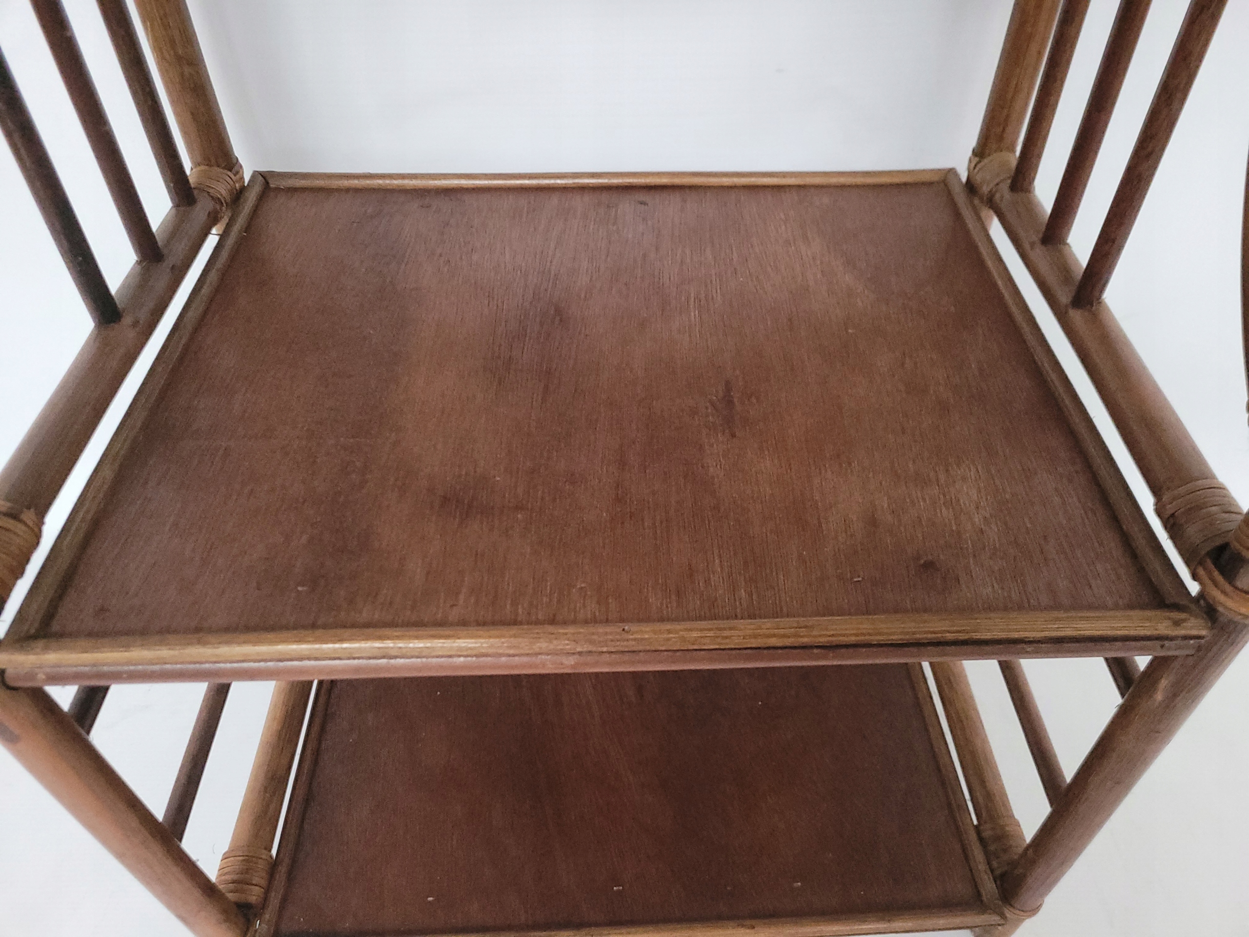 półka regał konstrukcja z bambusa, w górnej części plecionka. Stan dobry plus odbarwienia zadrapania.