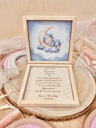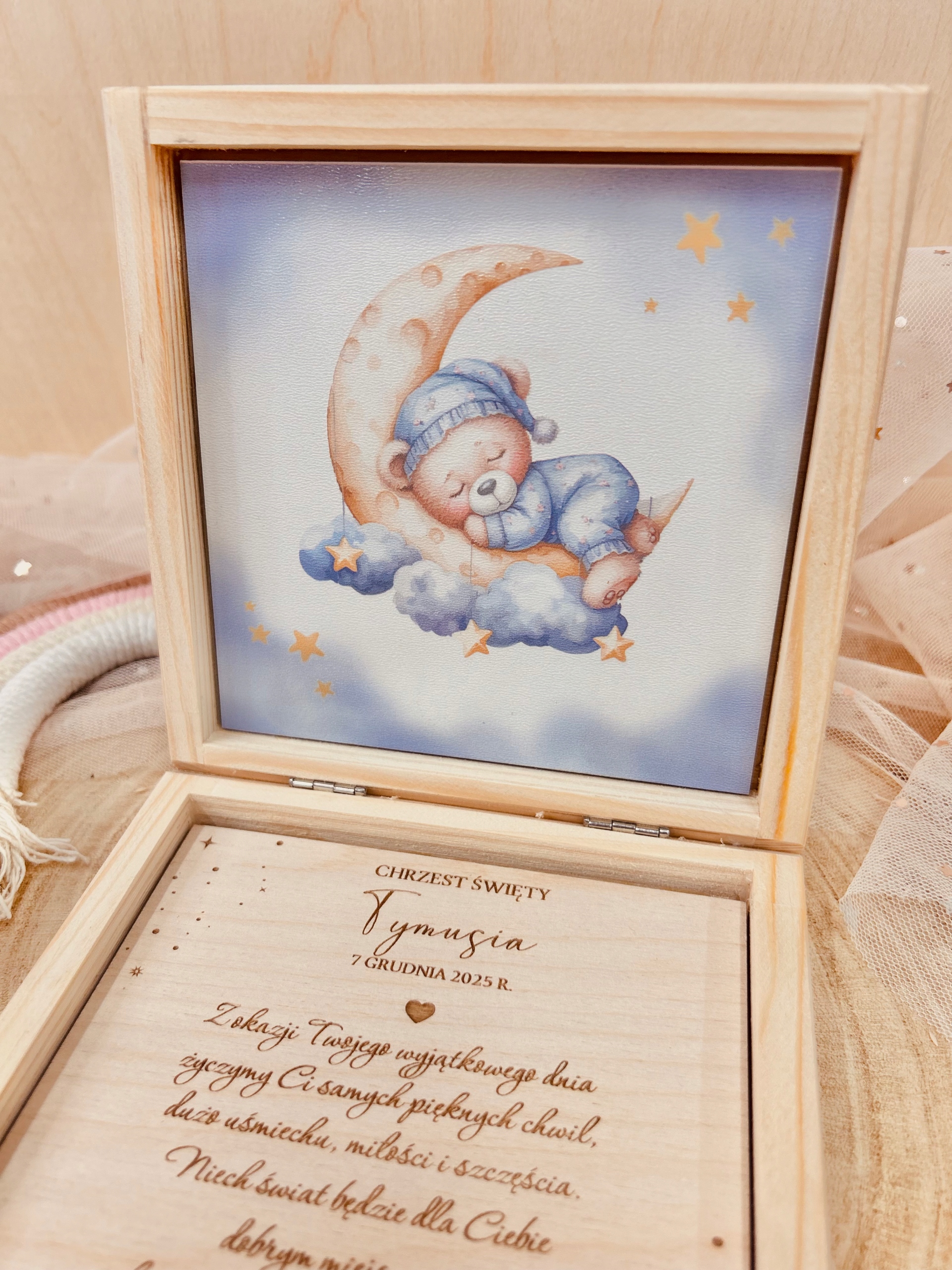 W pudełeczku znajdują się życzenia i podpis, które podlegają personalizacji. Do pudełeczka zmieszczą się banknoty i inne drobne upominki np. łańcuszek. Na zewnątrz pudełka grawerowane jest imię dziecka.