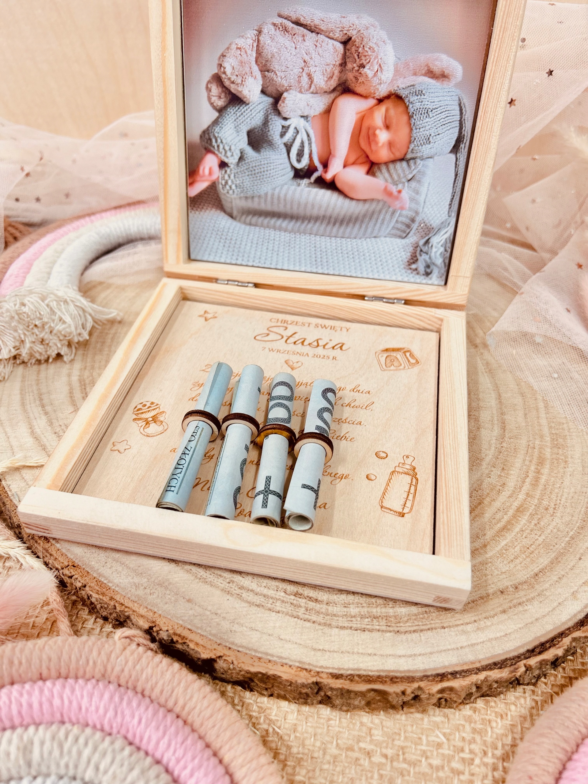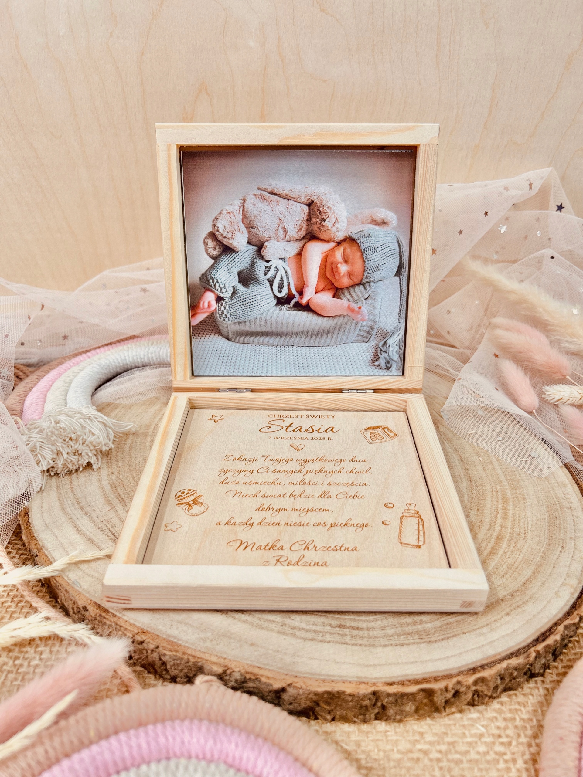 Drewniana Pamiątka Chrztu Świętego – Personalizowane Pudełko z Dedykacją i Zdjęciem