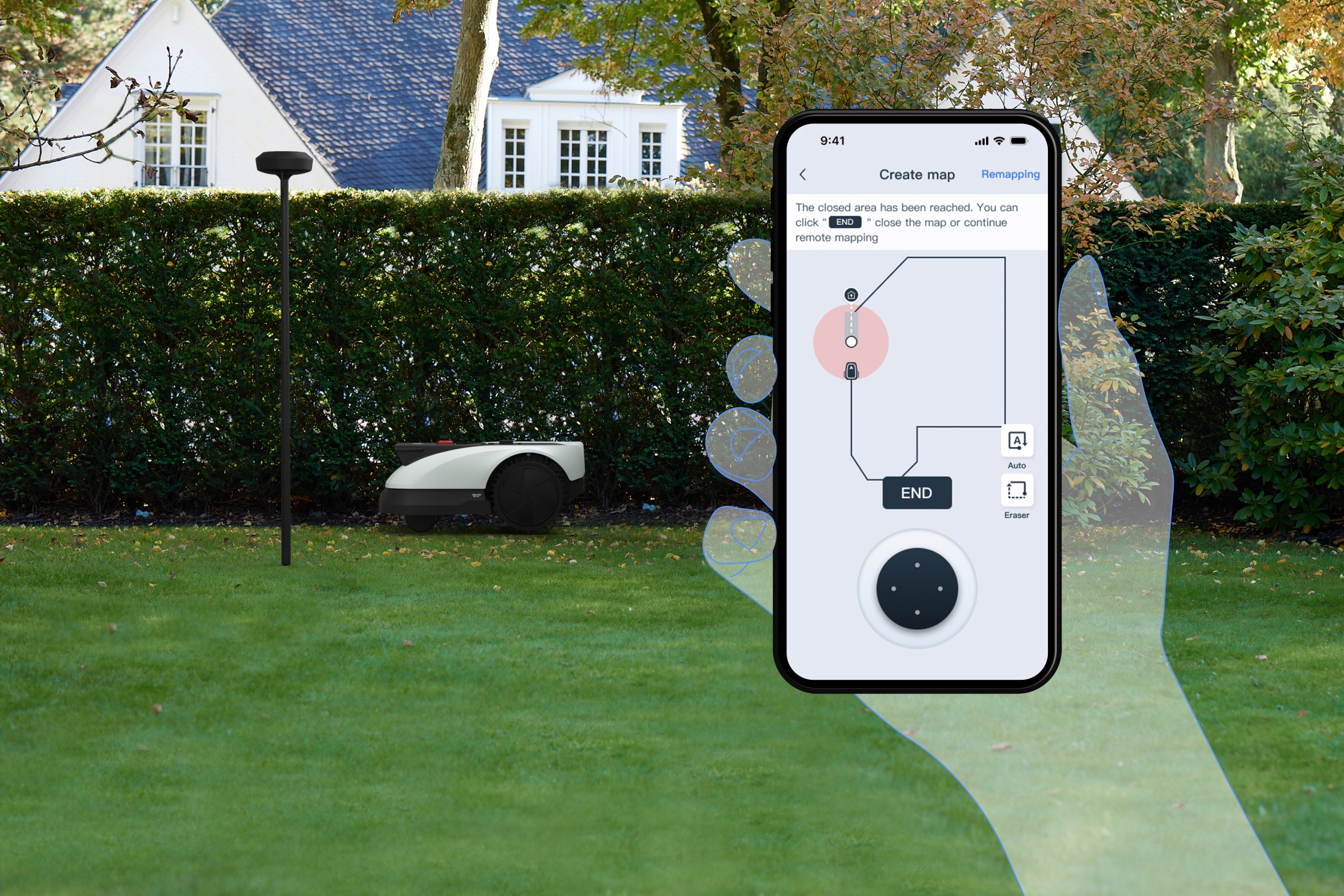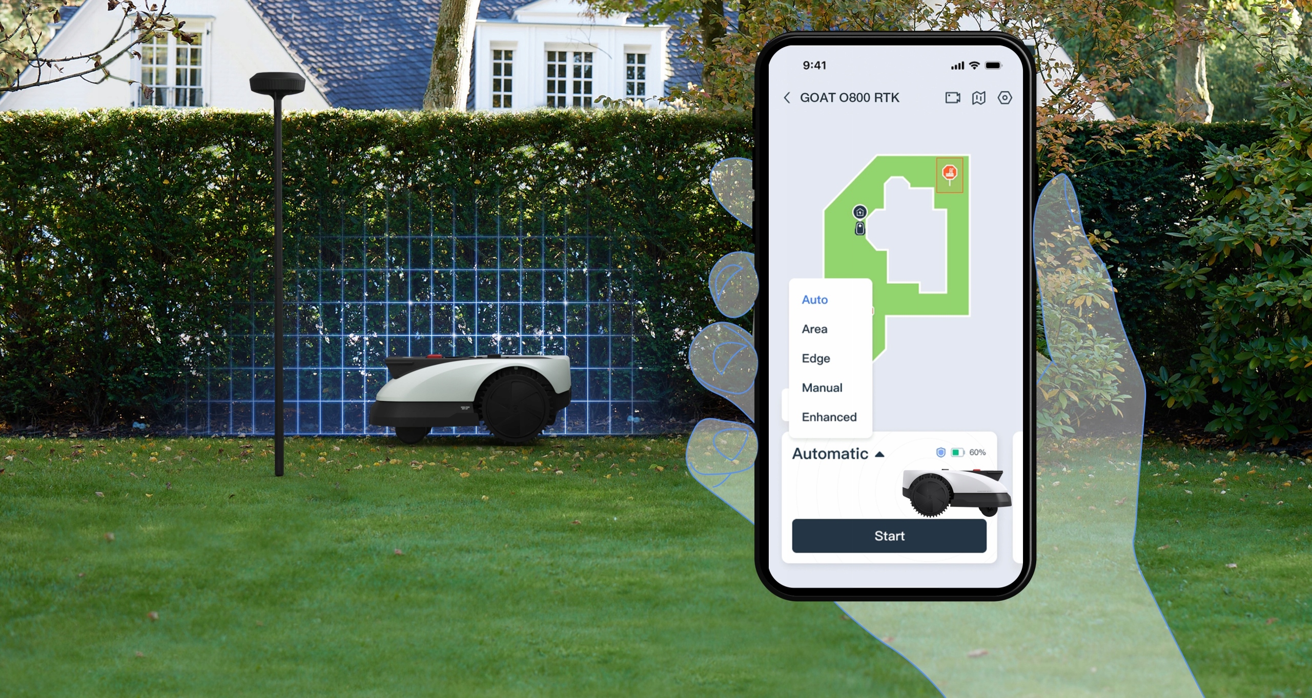 Innowacyjna kosiarka GOAT automatycznie wykrywa i definiuje wszystkie rodzaje granic, mapując ogród bez konieczności stosowania fizycznych znaczników. Użytkownicy mogą łatwo dostosować zmapowany obszar za pomocą pilota zdalnego sterowania aplikacji, dając im pełną kontrolę nad obszarem koszenia. Ta płynna integracja pozwala na szybką i łatwą konfigurację, zapewniając dokładną i spersonalizowaną mapę ogrodu dla optymalnych wyników koszenia.
