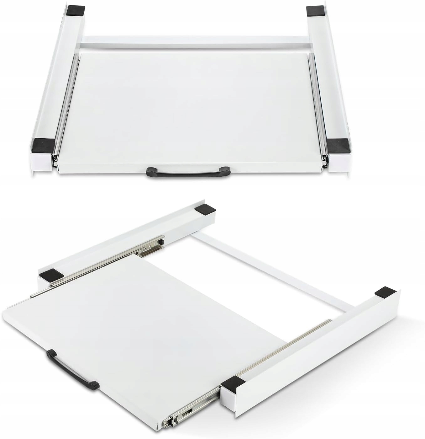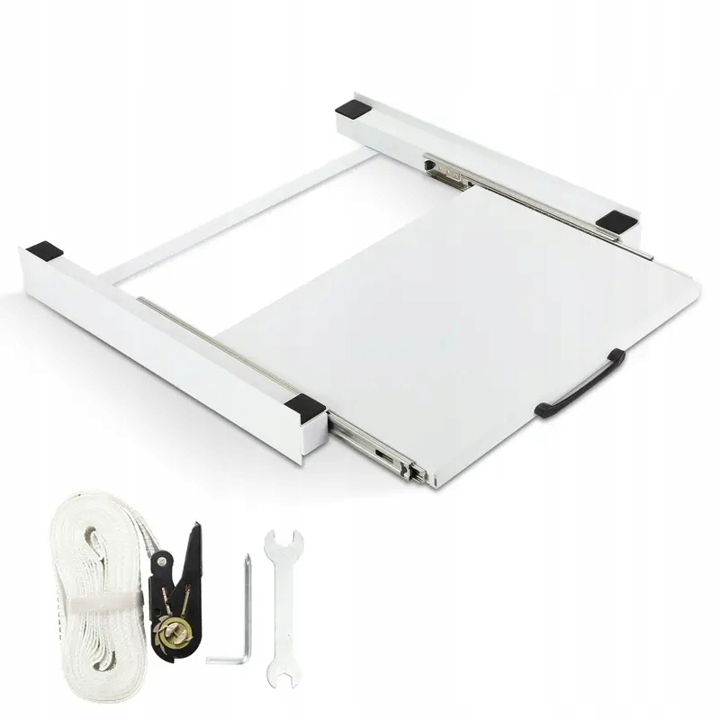 - Wyposażona w wysuwaną półkę o wymiarach 38 x 50 cm (uchwyt wymaga samodzielnego montażu), wytrzymuje obciążenie do 10 kg, co ułatwia przechowywanie innych rzeczy, takich jak kosze na pranie, proszek do prania, płyn do płukania tkanin itp.