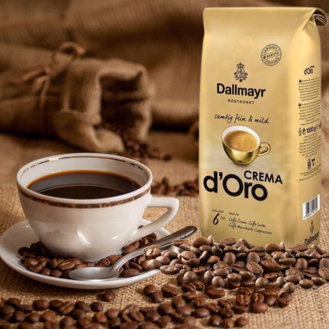 Dallmayr Crema D'oro. Szlachetne ziarna z gatunku arabika i robusta, które tworzą kawę Dallmayr Crema d’Oro, są starannie dobierane i ostrożnie palone. Dzięki temu uzyskujemy aksamitnie delikatną, jasną cremę i łagodny aromat.