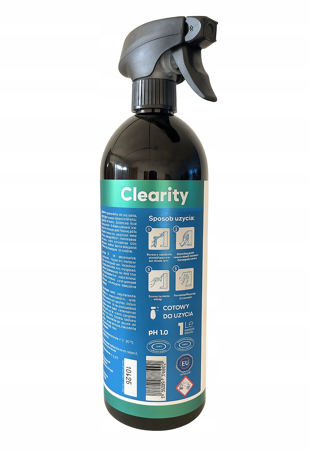 Clearity Scalex 1L to mocny, gotowy do użycia odkamieniacz o pH 1.0, przeznaczony do skutecznego usuwania uporczywych osadów wapiennych i mineralnych. Idealnie sprawdza się w łazience i kuchni – na bateriach, prysznicach, kabinach, brodzikach, płytkach, fugach oraz elementach ze stali nierdzewnej.