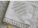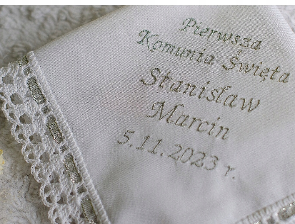Biała bawełniana chusteczka komunijna z pamiątkowym haftem, z ręcznie wykonaną koronką. Ozdobiona srebrną wstążeczką .