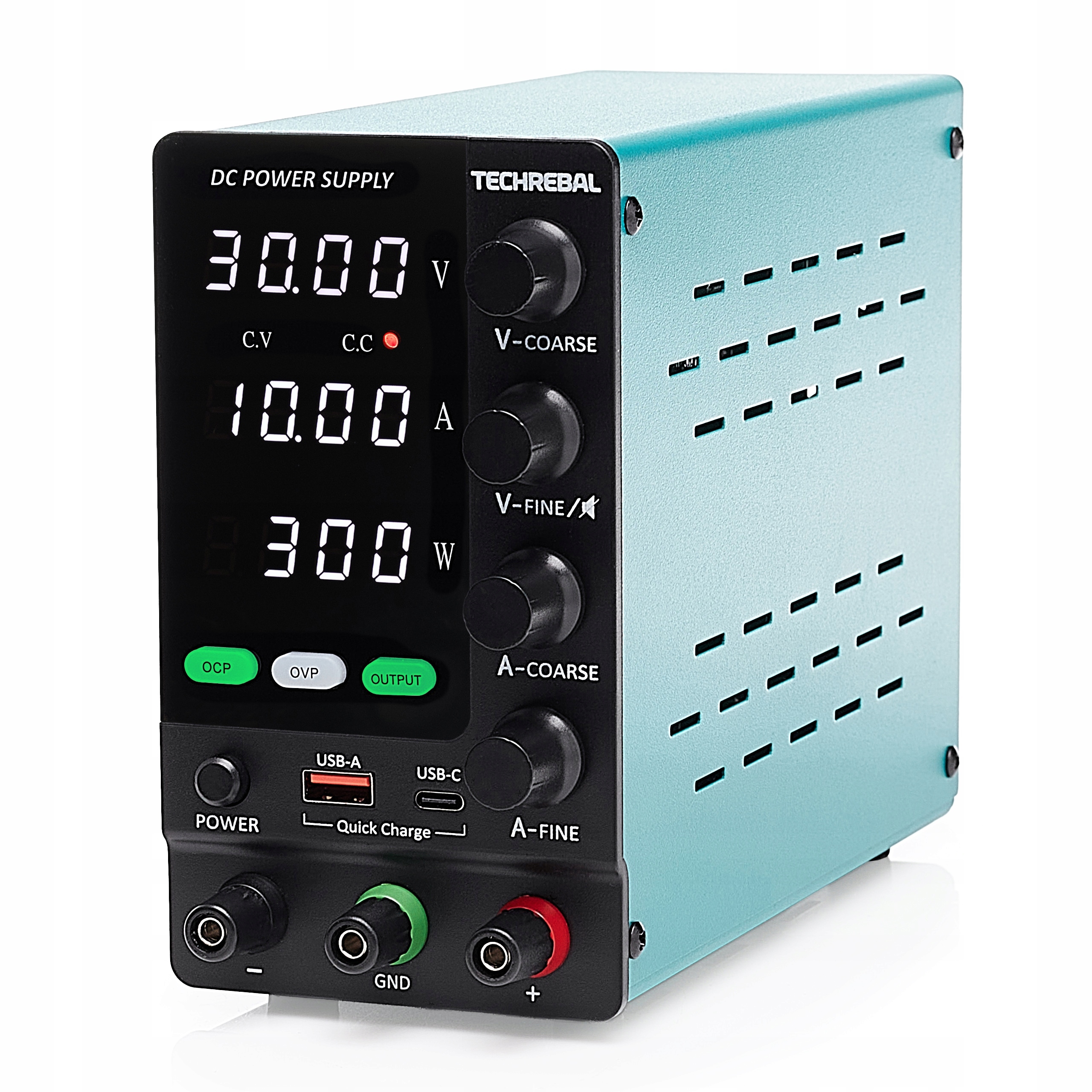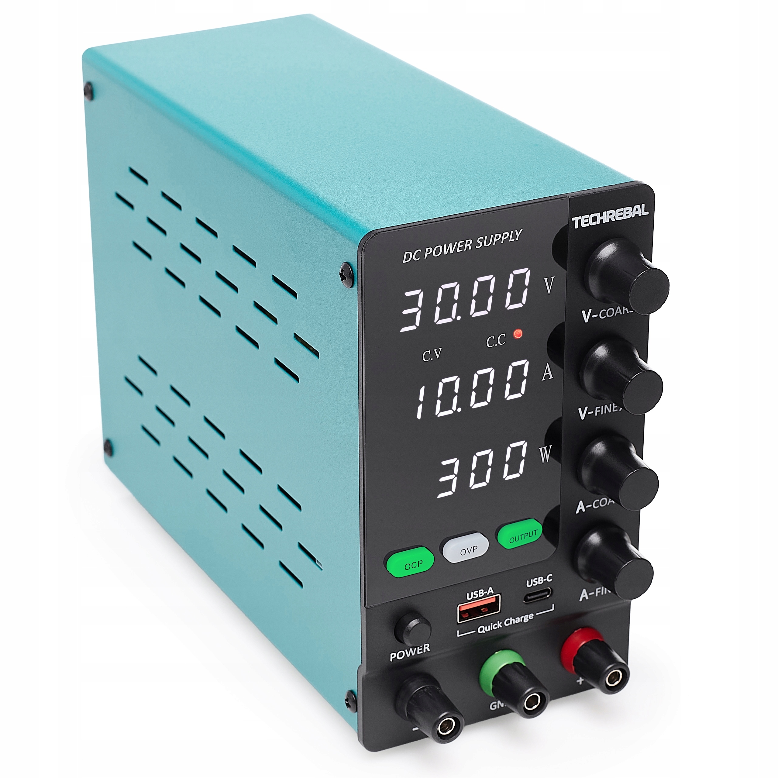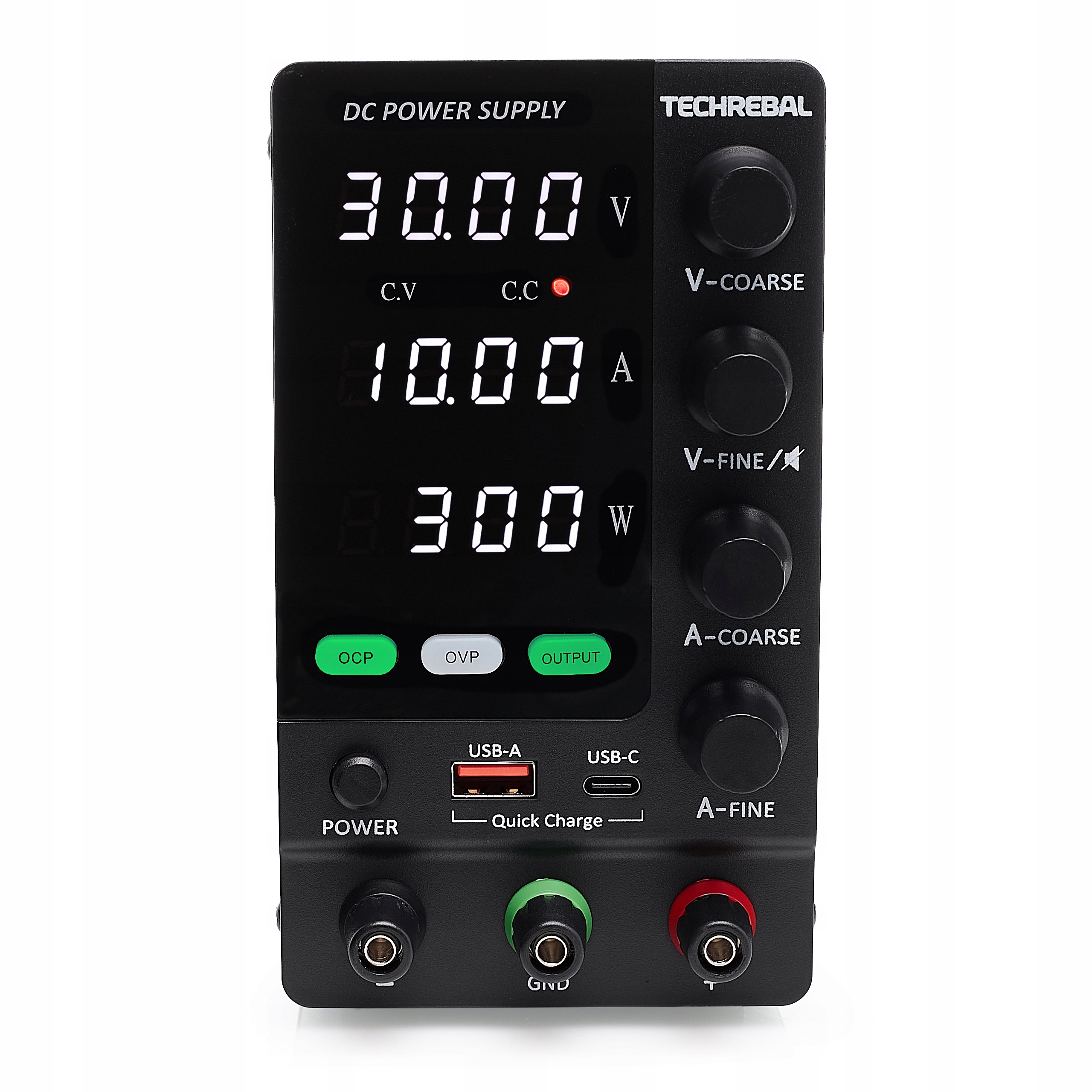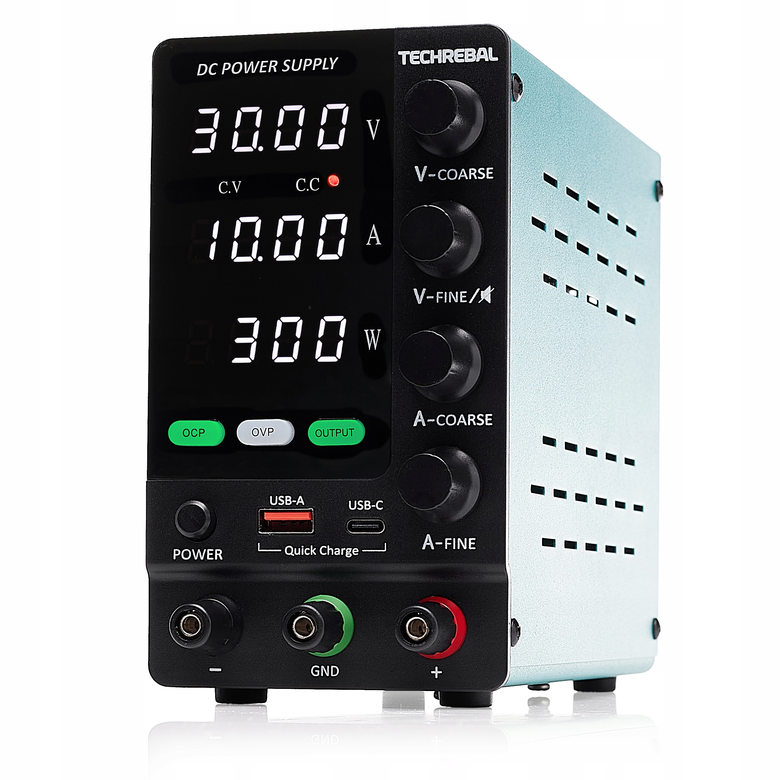 Techrebal SPS-C3010S to stabilizowany zasilacz laboratoryjny z płynną regulacją napięcia w zakresie od 0 do 30 V oraz prądu w zakresie od 0 do 10 A. Jego głównymi atutami są wysoka dokładność, możliwość ładowania baterii oraz czytelny wyświetlacz LCD. Zasilacz jest chłodzony cichym wentylatorem regulowanym temperaturą.